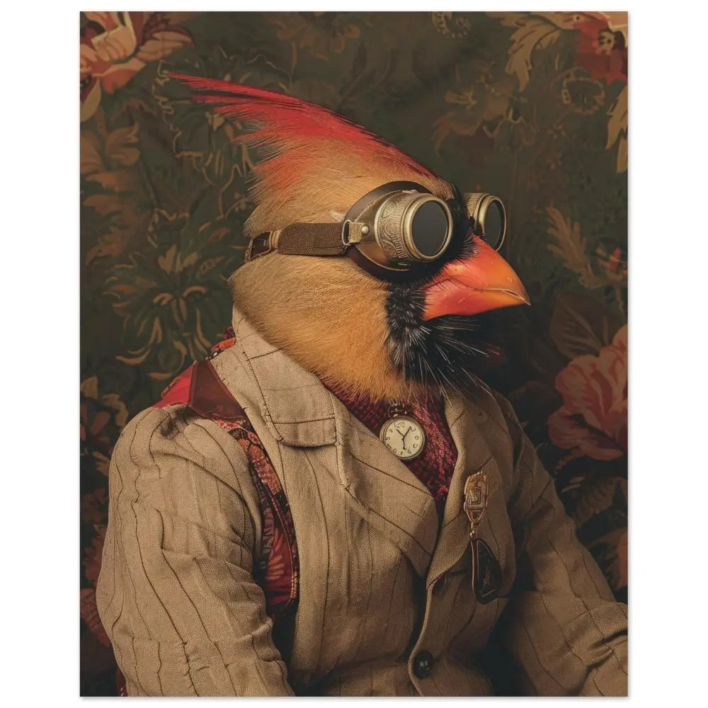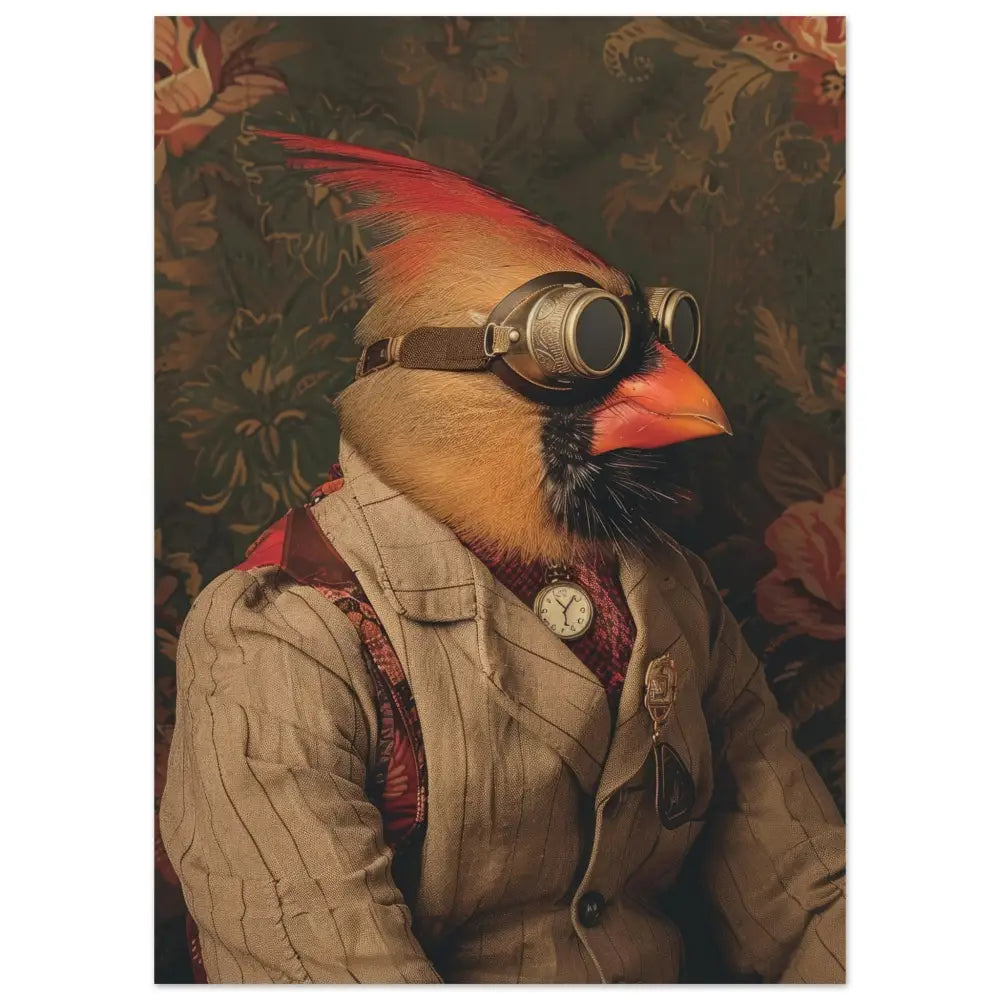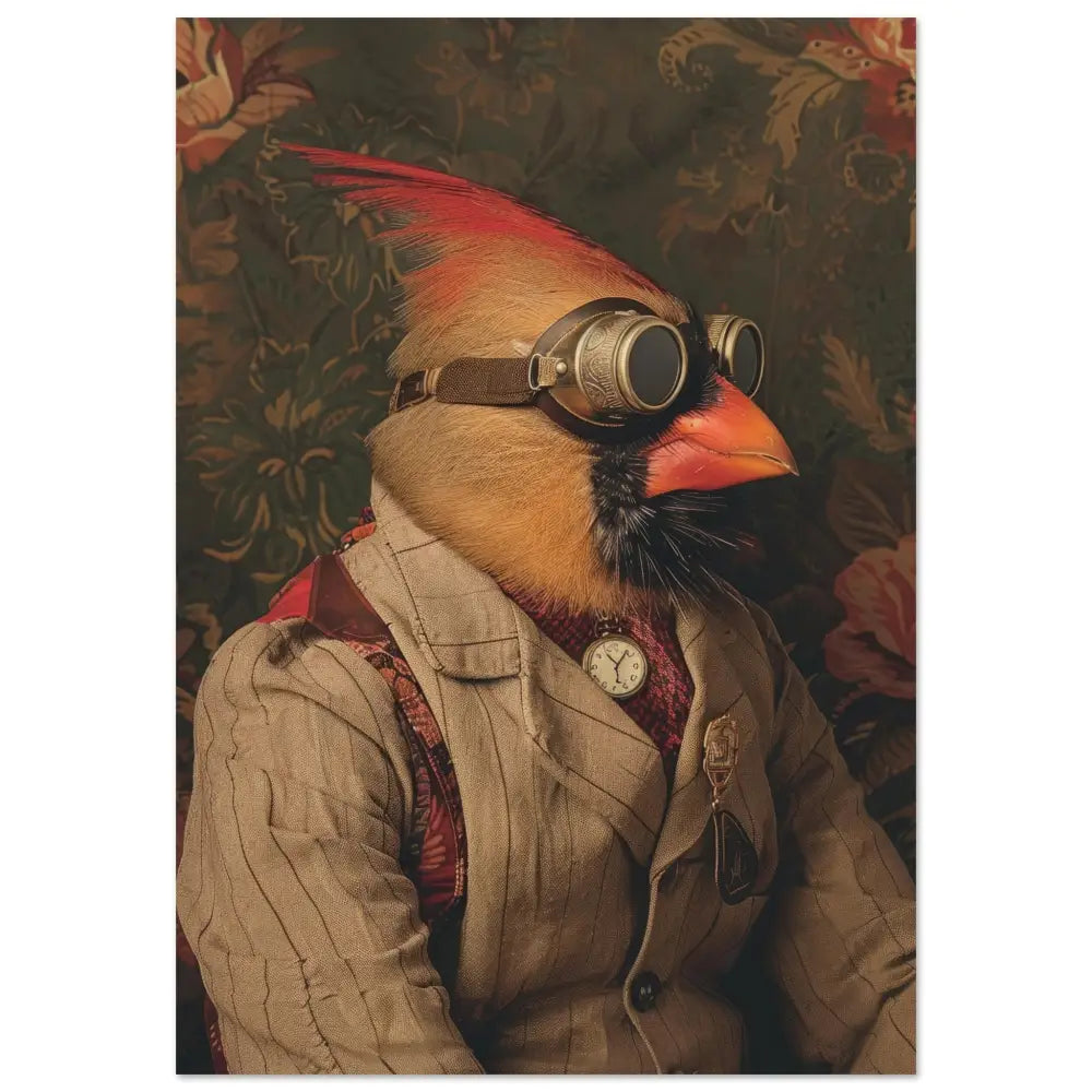 Deze afbeelding toont een dier, gekleed in een prachtige vintage steampunk outfit. Het draagt een elegante, roestbruine jas met streepjespatroon en leren accenten die een stoere uitstraling geven. Om de nek hangt een antieke, bronzen klok, die een subtiele finesse toevoegt. De kop is voorzien van een paar robuuste, retro-futuristische brillen met messing details en donkere glazen, wat het een exploratieve look geeft. De outfit wordt verder aangevuld met sofistisch bonte manchetjes en contrasterende stiksels, terwijl de achtergrond een verweerde, industriële sfeer uitstraalt met zacht vervaagde flora-elementen aan de randen.