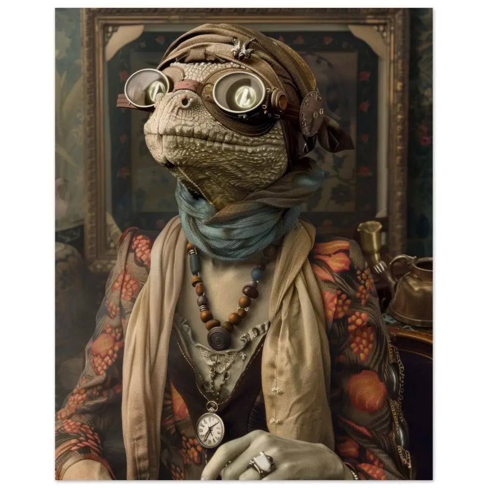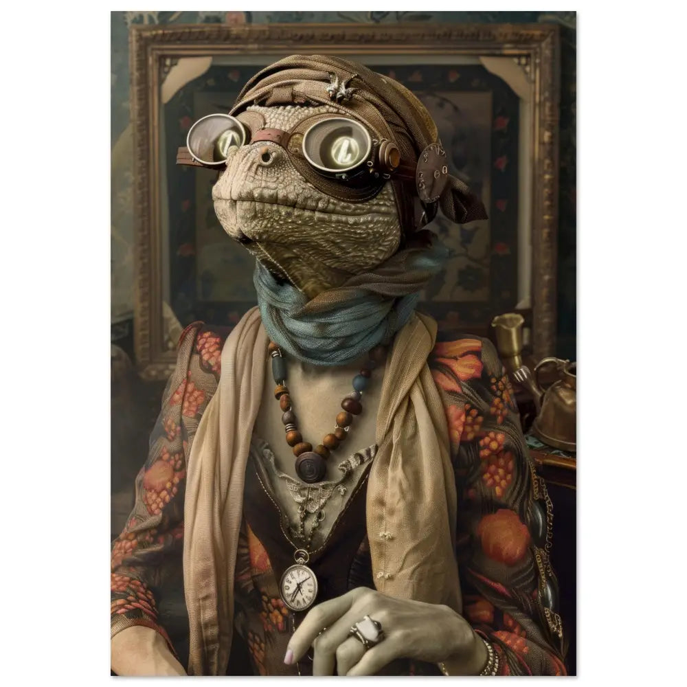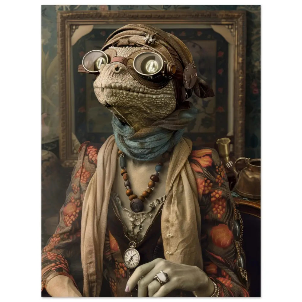 Deze afbeelding toont een dier, gekleed in een prachtige steampunk outfit. Het draagt een elegante, gebloemde jas met levendige rode en oranje bloemen die eruit springen tegen de donkere achtergrond. Om de nek hangt een antieke zilveren klok, die bijdraagt aan de nostalgische uitstraling. De kop wordt gesierd door een paar grote, retro-futuristische brillen met metalen details in bronskleur en heldere lenzen, die een mysterieuze allure geven. De voorpootjes zijn voorzien van sierlijke, lichtbruine manchetjes die het geheel prachtig afronden. De achtergrond is gedetailleerd met een rijk versierd schilderij en antieke accessoires, wat een old-world ambiance creëert.