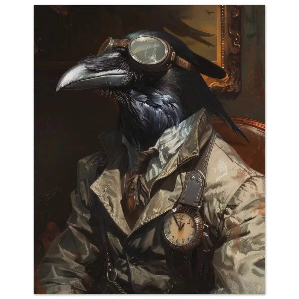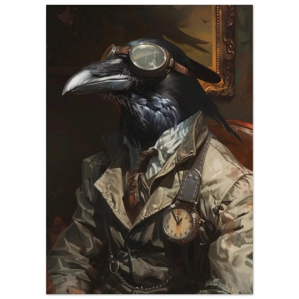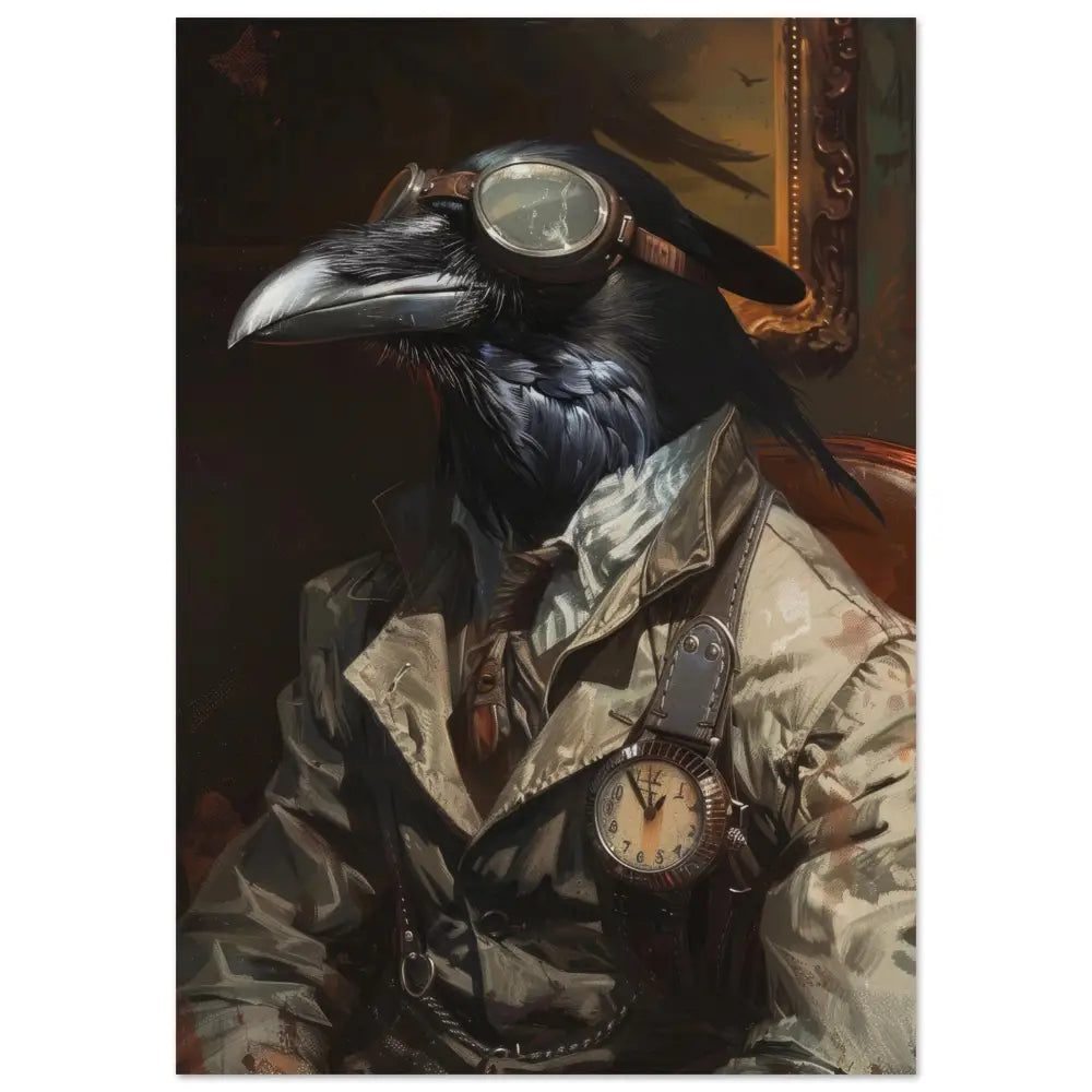Deze afbeelding toont een dier, gekleed in een prachtige vintage steampunk outfit. Het draagt een elegante, beige trenchcoat met donkere accenten en verfijnde stiksels, perfect aansluitend bij de klassieke uitstraling. Om de nek hangt een antieke bronzen klok, die de mystieke sfeer benadrukt. De kop wordt gesierd door een paar grote, retro-futuristische brillen met metalen details in koperkleur, waardoor het lijkt alsof het overal klaar voor is. De vleugeltoppen zijn subtiel versierd met leren en metalen accessoires die het geheel compleet maken. De donkere, schaduwrijke achtergrond voegt diepte en een gevoel van mysterie toe aan het portret.