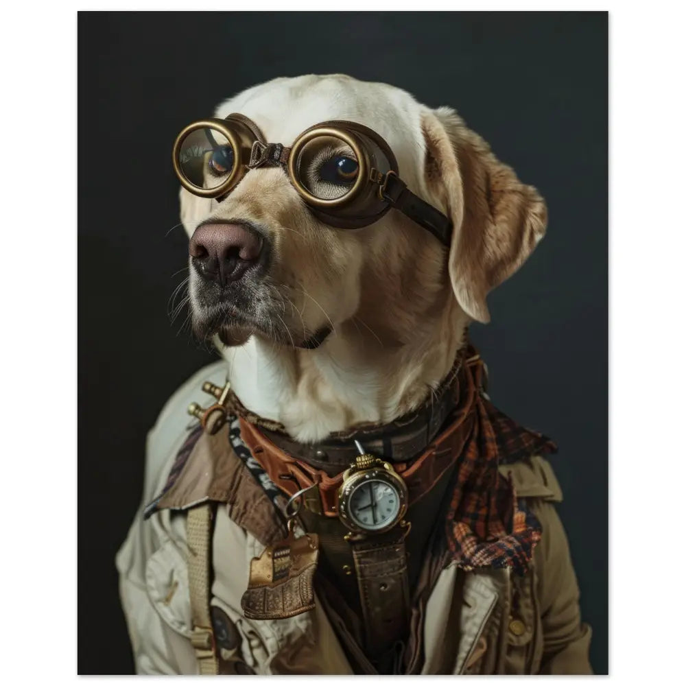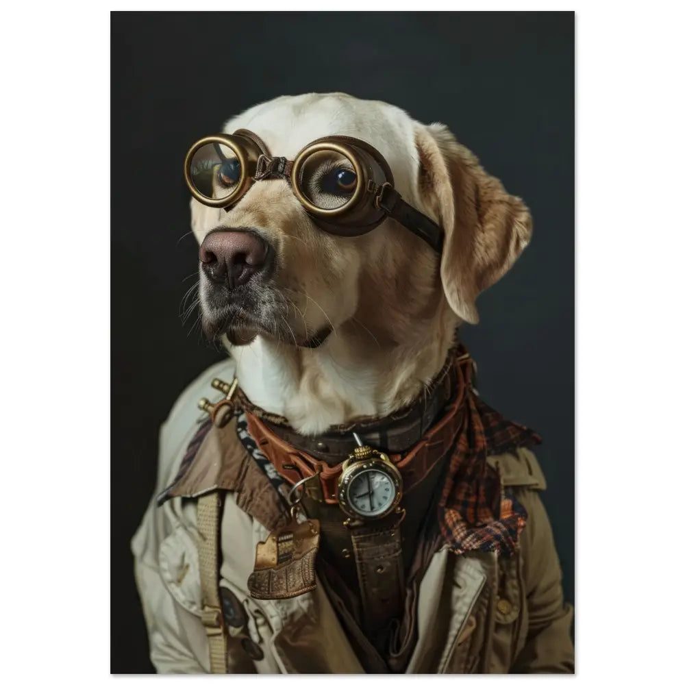 Deze afbeelding toont een dier, gekleed in een prachtige vintage steampunk outfit. Het draagt een elegante, lichtbruine jas met subtiele geruite patronen en met leer verstevigde schouderstukken. Om de nek hangt een antieke gouden klok, met verfijnde details die de tijdloze charme benadrukken. Het hoofd wordt gesierd door een opvallende, bronzen bril met dikke, ronde lenzen en robuuste metalen accenten, wat het een avontuurlijke blik geeft. De voorpoten zijn versierd met stijlvolle, donkere bontachtige manchetjes, en leren riempjes met contrasterende stiksels completeren het geheel. De achtergrond is donker en neutraal, waardoor de steampunk-uitstraling van de hond nog meer tot uiting komt.
