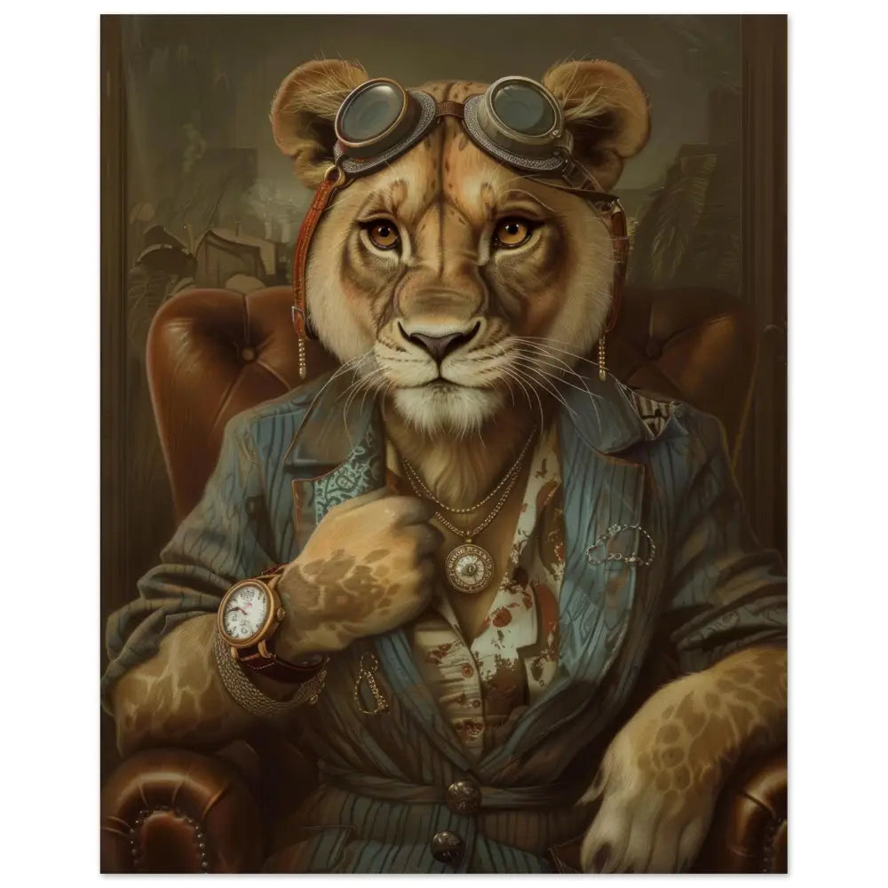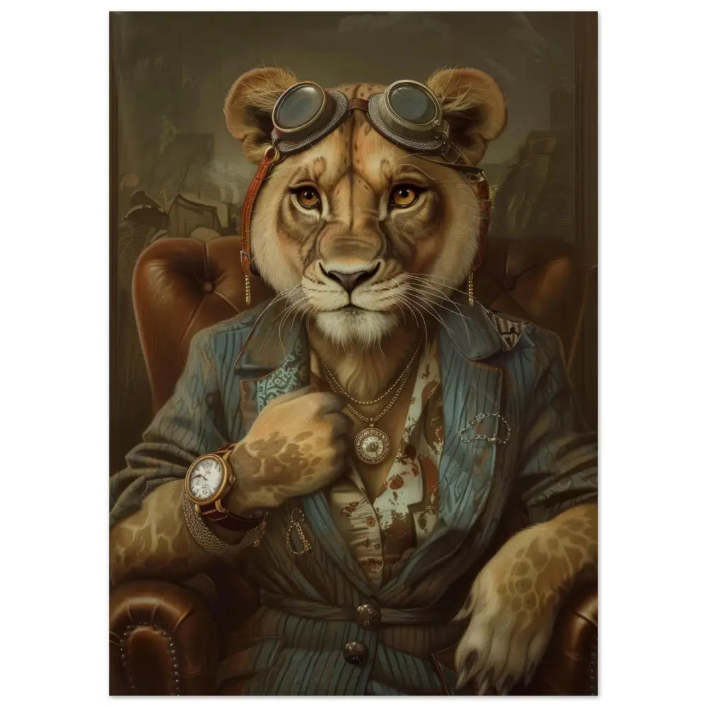 Deze afbeelding toont een dier, gekleed in een prachtige vintage steampunk outfit. Het draagt een elegant gestreept kostuum in zachtblauwe tinten met delicate bloemenpatronen en koperkleurige accenten. Om de nek hangt een antieke gouden klok, die de aristocratische uitstraling versterkt. De kop wordt gesierd door een paar grote, retro-futuristische brillen met sierlijke metalen details in zilverkleur, waardoor deze eruitziet als een avontuurlijke tijdreiziger. De poten zijn voorzien van verfijnde, bruinleren manchetten die het geheel afmaken. De achtergrond heeft een mysterieus industrieel landschap, met details van tandwielen en gedempte verlichting, die de steampunk sfeer versterken.