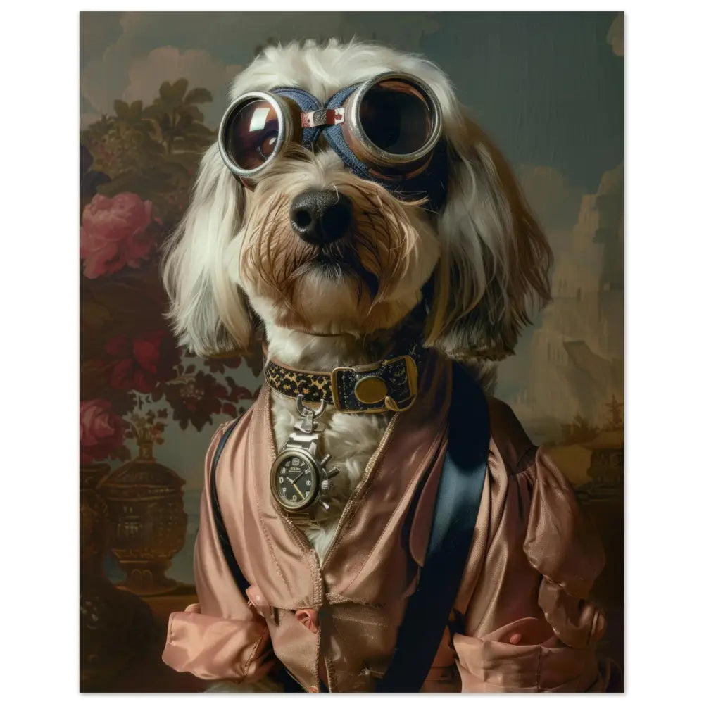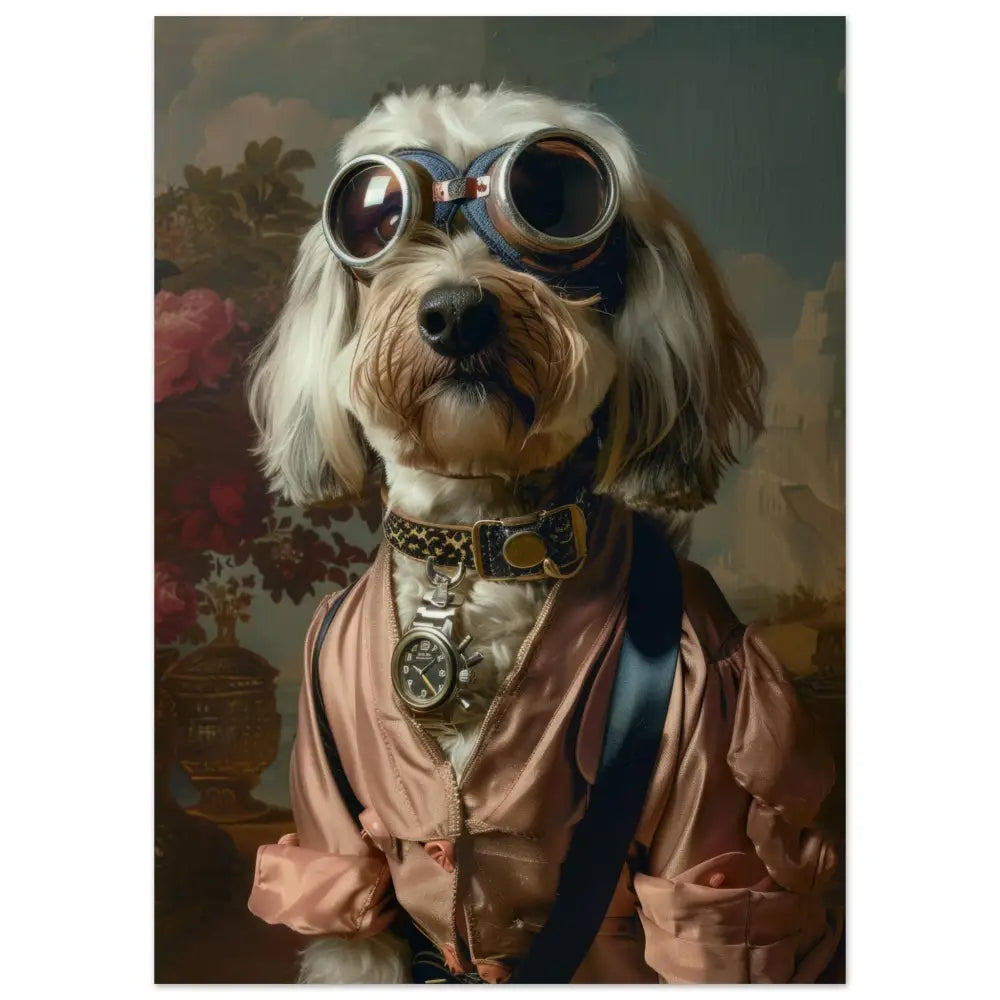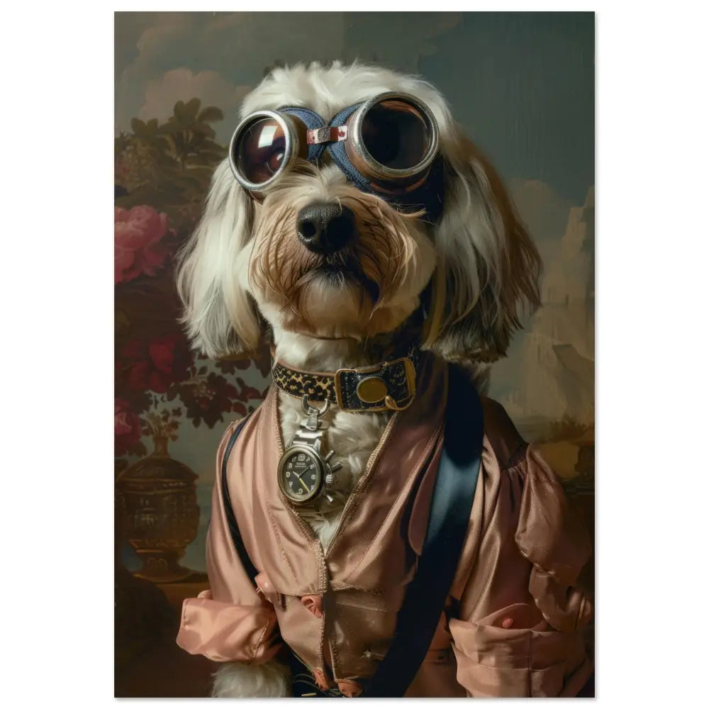 Deze afbeelding toont een dier, gekleed in een prachtige vintage steampunk outfit. Het draagt een verfijnde, perzikkleurige jas met delicate stiksels en satijnen accenten, die de vorstelijke uitstraling versterken. Om de nek hangt een antieke zilveren klok met een sierlijke wijzerplaat, subtiel contrasterend met de donkere achtergrond. De kop wordt sierlijk omlijst door een stel indrukwekkende, bronzen retro-futuristische brillen met gedetailleerde metalen elementen, die de avontuurlijke geest van het dier benadrukken. De voorpootjes zijn elegant voorzien van lichtroze, bontachtige manchetjes en leren riempjes voor extra stijl. De achtergrond is versierd met een weelderig bloemmotief en antieke