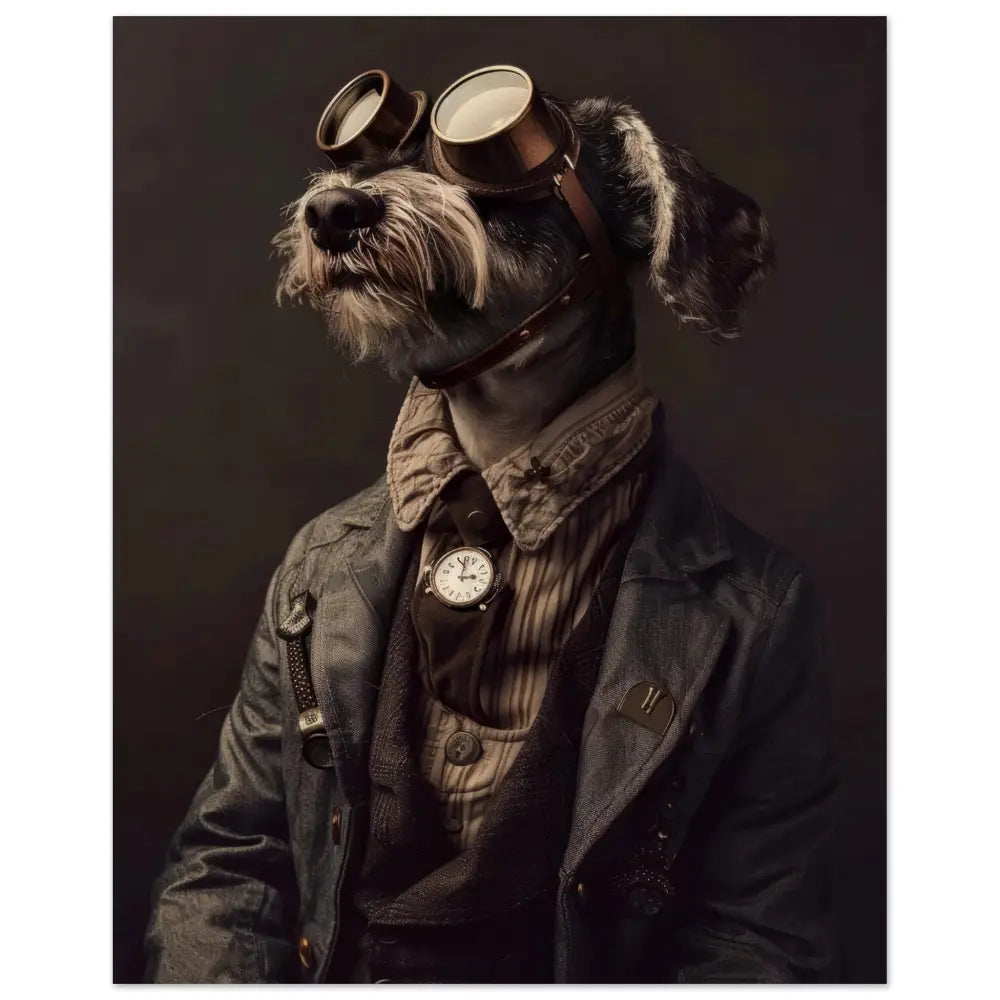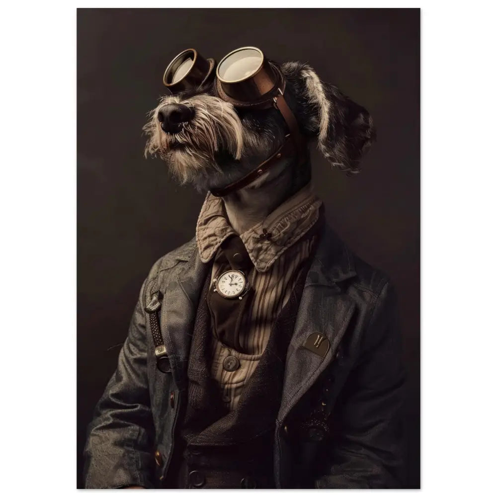 Deze afbeelding toont een dier, gekleed in een prachtige vintage steampunk outfit. Het draagt een verfijnde, grijze jas met subtiele, streepjespatronen en knopen met koperachtige accenten. Om de nek hangt een antieke zilveren klok, die de klassieke charme van het geheel benadrukt. De kop wordt compleet gemaakt door een paar indrukwekkende, bronzen retro-futuristische brillen met gedetailleerde metalen afwerking, wat het dier een elegante ontdekkingsreiziger look geeft. Leren accenten en contrasterende stiksels complementeren de verfijnde uitstraling, samen met de gerafelde kledingstukken. De achtergrond is donker en ingetogen, waardoor het diertje en zijn outfit nog meer in het oog springen.