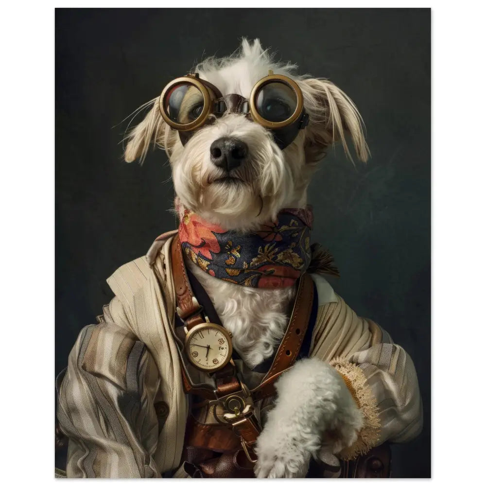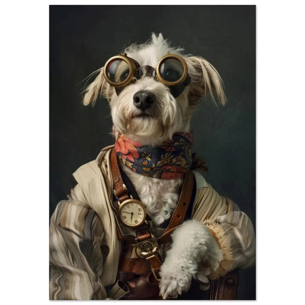 Deze afbeelding toont een dier, gekleed in een prachtige vintage steampunk outfit. Het draagt een chique beige gestreepte jas met subtiele patronen en verfijnde accenten. Om de nek hangt een antieke gouden klok, die de verfijnde uitstraling van het portret benadrukt. De kop wordt gesierd door een groot paar bronzen retro-futuristische brillen met metalen details, wat een avontuurlijke uitstraling geeft. De voorpootjes zijn voorzien van elegante, crèmekleurige bontachtige manchetjes met delicate randafwerking. De achtergrond heeft een rustieke, donkere tint die de aandacht vestigt op de weelderige details van het kostuum en de accessoires van het dier.