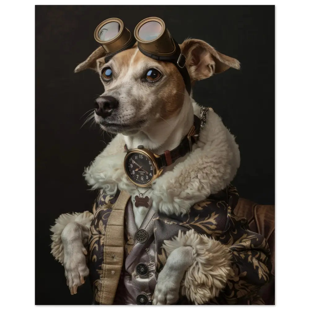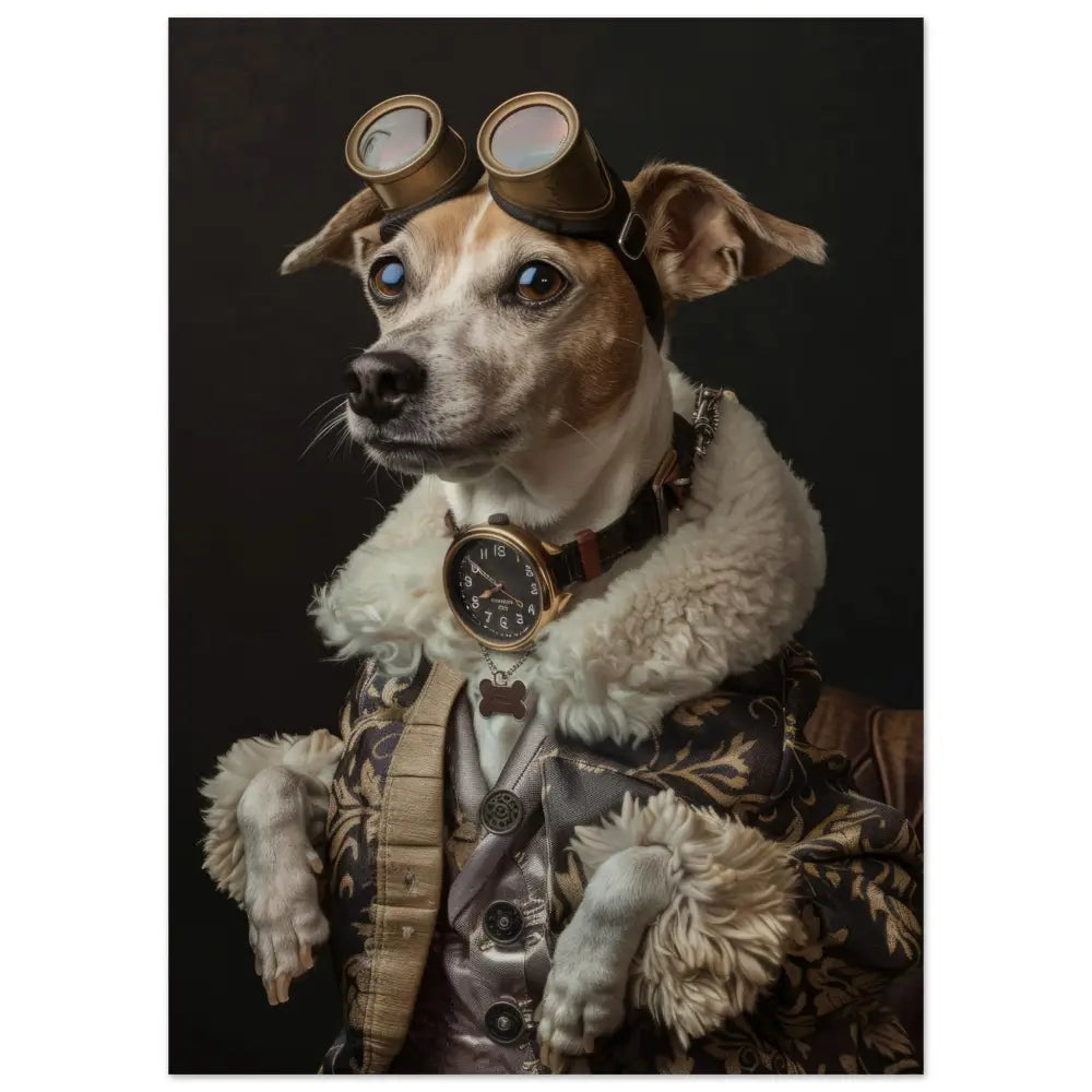 Deze afbeelding toont een hond, gekleed in een prachtige vintage steampunk outfit. De hond draagt een koninklijke, donkerblauwe jas met ingewikkelde gouden patronen en fluweelachtige accenten. Om de nek hangt een antieke zwarte klok, die de aristocratische uitstraling versterkt. Op het hoofd prijkt een paar grote, retro-futuristische brillen met metalen details in bronzen kleur, wat hem een avontuurlijke tijdreiziger doet lijken. De pootjes zijn voorzien van elegante, witte bontachtige manchetjes en leren accenten, die het geheel afronden. De achtergrond is donker en minimalistisch, waardoor de stijlvolle outfit nog meer opvalt.
