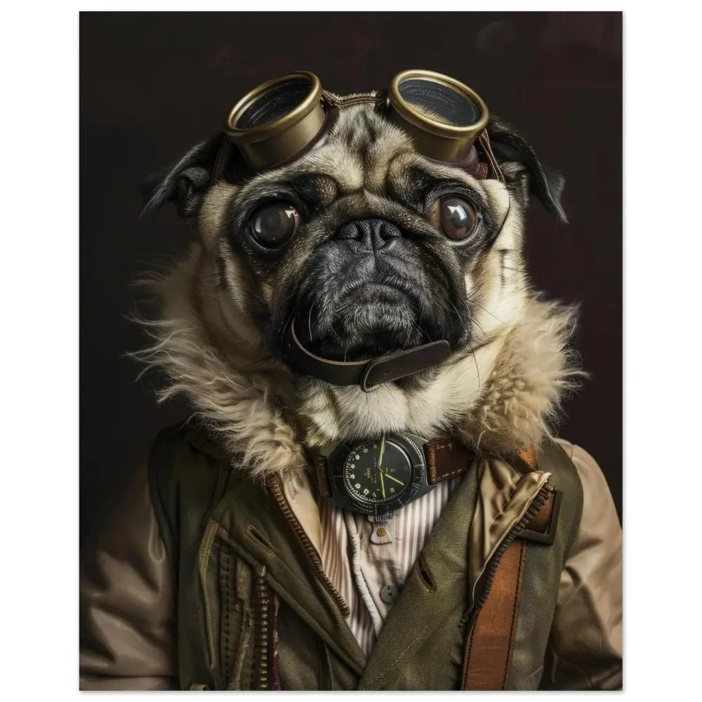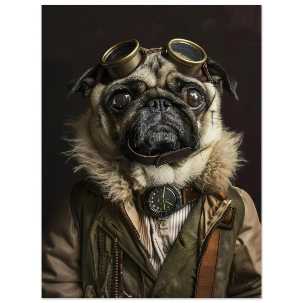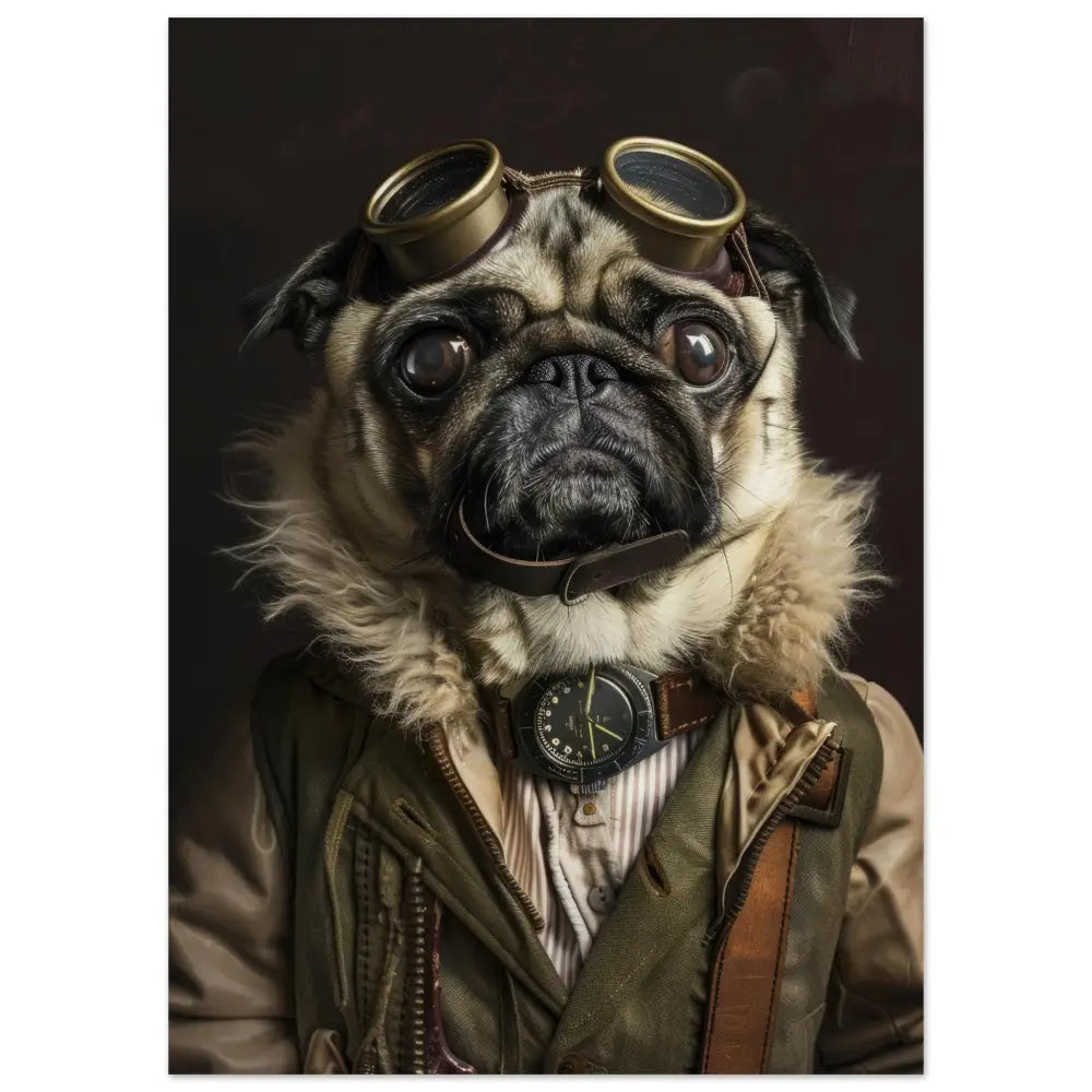 Deze afbeelding toont een dier, gekleed in een prachtige vintage steampunk outfit. De jas is olijfgroen met leren accenten en met grove stiksels, die de robuuste uitstraling versterken. Om de nek hangt een antieke zwarte klok met een klassieke wijzerplaat, die de charmante retro look compleet maakt. Op het hoofd draagt het dier een setje bronzen brillen met metalen details, die de ogen beschermt en een wetenschappelijke touch toevoegt. De manchetjes zijn bekleed met pluizig, grijs bont, wat zorgt voor een luxe gevoel. De achtergrond is donker en mysterieus, waardoor het geheel een enigszins dramatische sfeer krijgt.