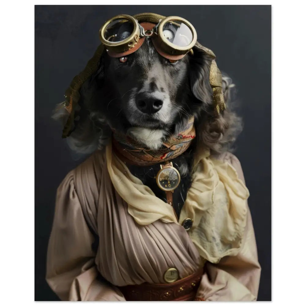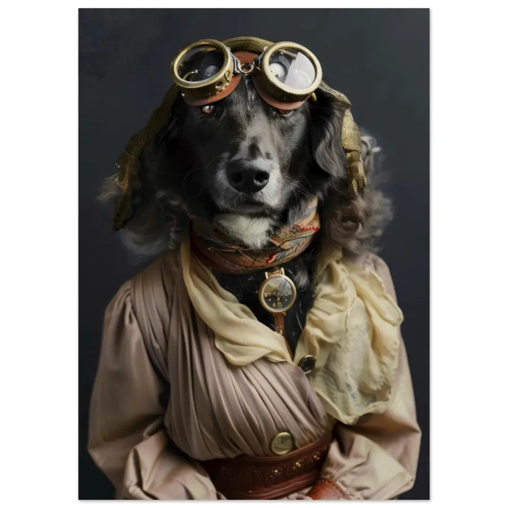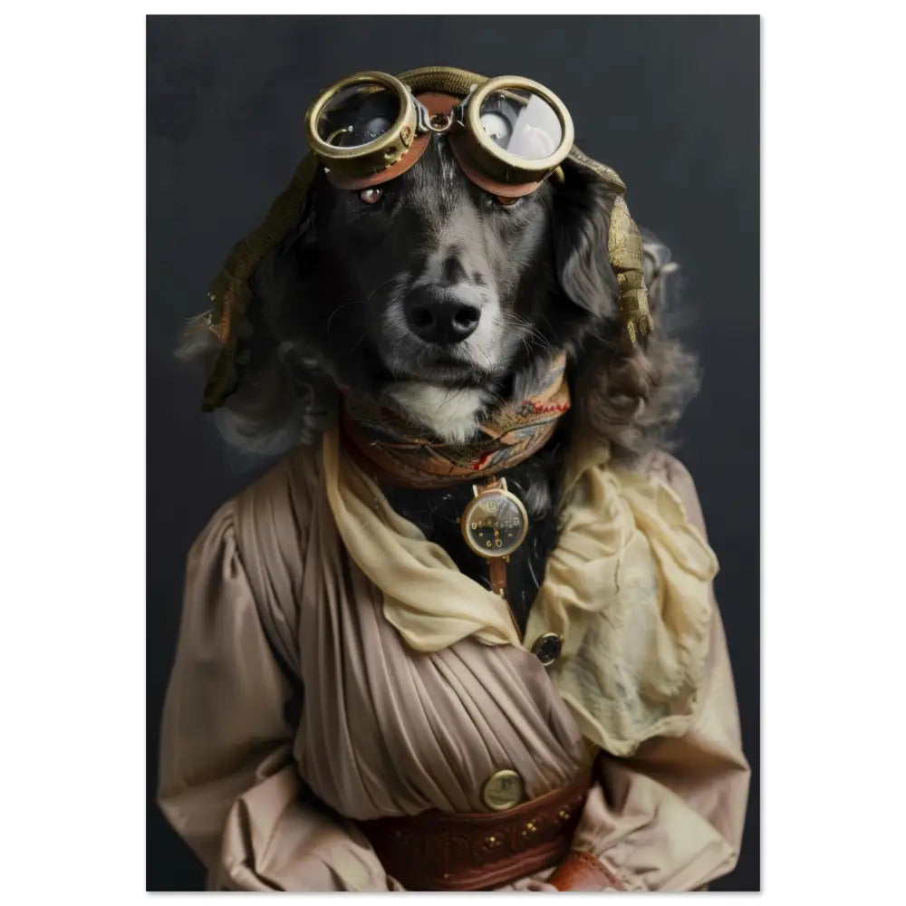 Deze afbeelding toont een dier, gekleed in een prachtige vintage steampunk outfit. Het draagt een sierlijke, beige jas met subtiele plooien en gouden accenten. Om de nek hangt een antieke gouden klok, die een gevoel van nostalgie uitstraalt. Het hoofd wordt gesierd door grote, bronzen retro-futuristische brillen, voorzien van complexe metalen details die een avontuurlijke geest oproepen. De pootjes zijn verfraaid met elegante manchetjes en leren accenten, waarvan de details met contrasterende steken zijn afgewerkt. De achtergrond is donker en mysterieus, wat de focus volledig op het stijlvolle en tijdloze uiterlijk van het dier blijft leggen.