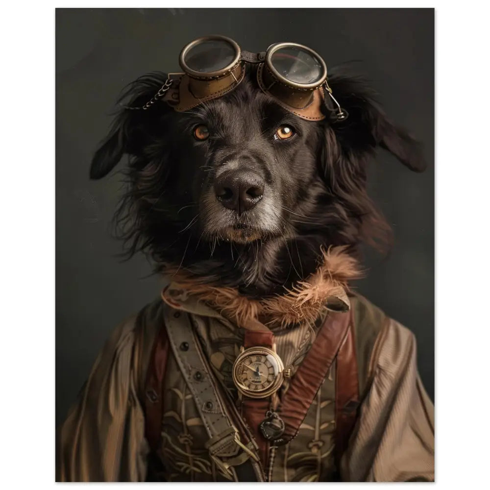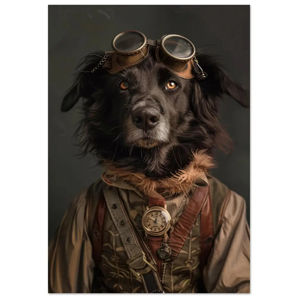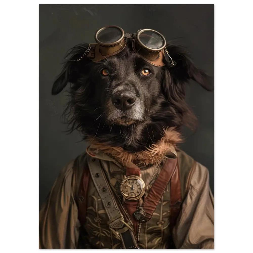 Deze afbeelding toont een hond, gekleed in een prachtige vintage steampunk outfit. Het draagt een elegante, olijfgroene jas met subtiele streepjes en intricately geborduurde patronen. Om de nek hangt een antieke gouden klok die de klassieke charme versterkt. De hond draagt een opvallende retro-futuristische bril met robuuste, bronzen metalen details die zijn avontuurlijke kant benadrukken. Extra accessoires zoals een bruin leren harnas met stalen gespen en een zachte, beige bonten kraag maken de outfit compleet. De achtergrond is sfeervol donker en mysterieus, wat de indrukwekkende look van de hond nog meer benadrukt.