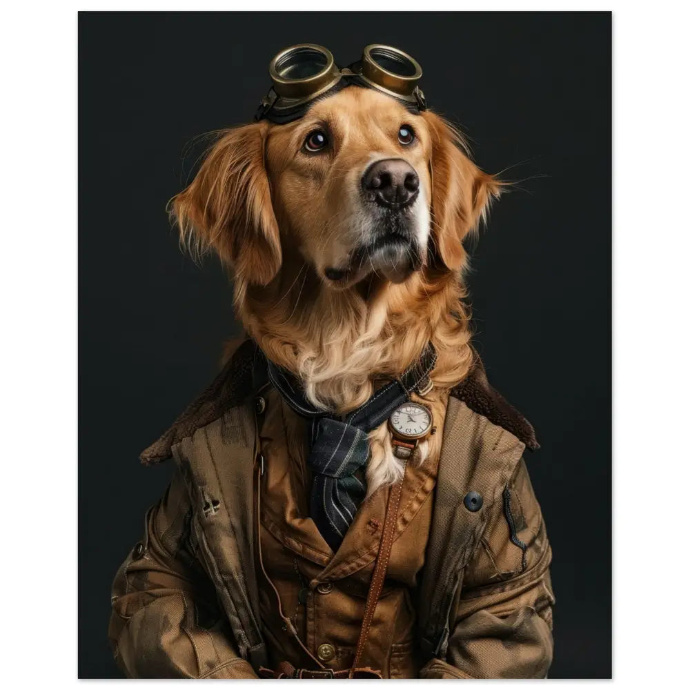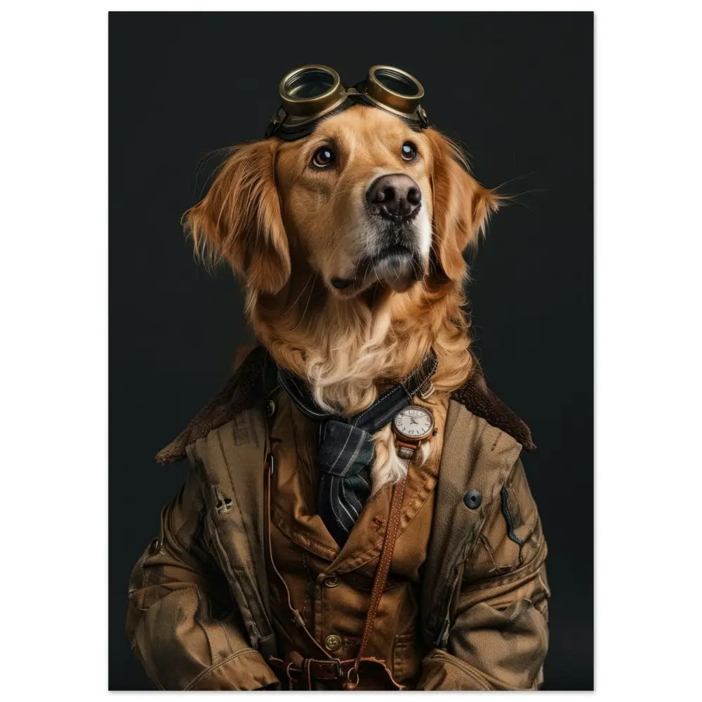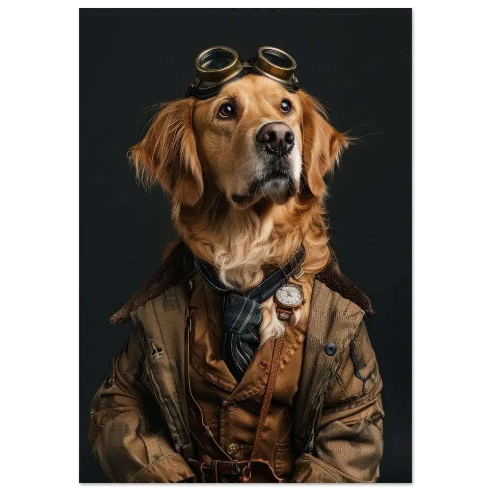 Deze afbeelding toont een dier, gekleed in een prachtige vintage steampunk outfit. Het draagt een verfijnde, bruine jas met subtiele versieringen en leren accenten. Om de nek hangt een antieke bronzen klok, die de historische charme versterkt. De kop is versierd met een paar grote, retro-futuristische brillen met metalen details in goudkleur, waardoor het lijkt op een bliksemafleider uit de industriële revolutie. De pootjes zijn voorzien van robuuste, leren manchetten die het geheel afmaken. De achtergrond is eenvoudig en donker, waardoor het dier nog meer opvalt en de steampunk-elementen extra benadrukt.