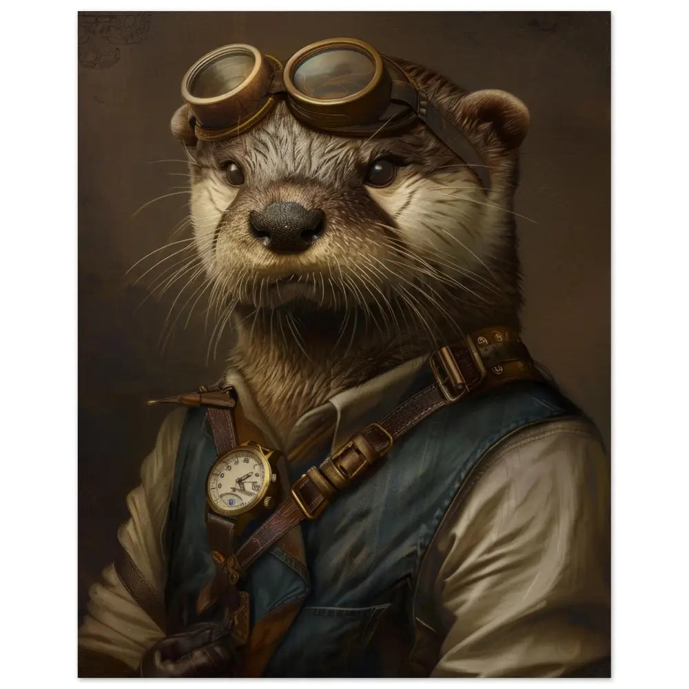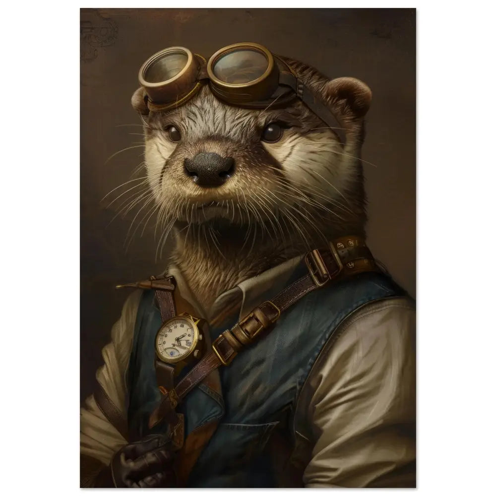 Deze afbeelding toont een dier, gekleed in een prachtige vintage steampunk outfit. Het draagt een stijlvolle diepblauwe jas met gouden gespen en leren accenten, die een stoere flair toevoegen. Om zijn nek hangt een antieke gouden klok, subtiel fonkelend en hintend naar verloren tijden. De kop is versierd met een paar robuuste, koperkleurige brillen met elegant bewerkte metalen details, die het uiterlijk van een gedreven ontdekkingsreiziger benadrukken. De voorpoten zijn voorzien van donkere, leren manchetjes die het geheel afmaken met contrasterende stiksels. De achtergrond toont een vervaagde, industriële scène, perfect passend bij het steampunk-thema en de avontuurlijke sfeer.