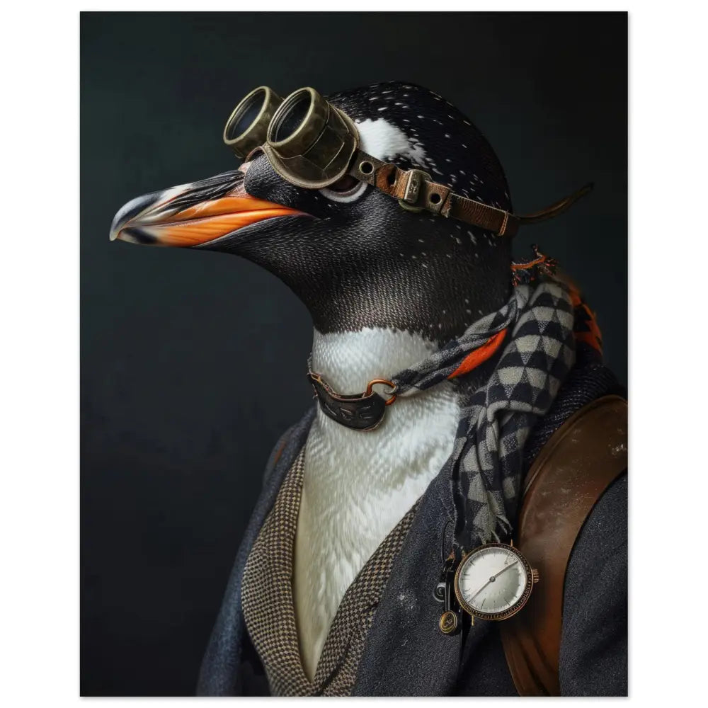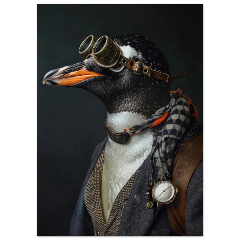 Deze afbeelding toont een dier, gekleed in een prachtige vintage steampunk outfit. Het draagt een stijlvol zwarte jas met een subtiel ruitenpatroon en leren accenten op de schouders, wat zorgt voor een elegante en robuuste look. Om de nek hangt een antieke zilveren klok, die het beeld versterkt met een vleugje nostalgie. De kop wordt gesierd door een paar grote, retro-futuristische brillen met metalen details in een verweerde bronzen kleur, wat het uiterlijk van een gedurfde ontdekkingsreiziger geeft. De vleugels zijn verrijkt met zachte geruite manchetjes die extra comfort en charme toevoegen. De achtergrond is donker en mysterieus, wat de aandacht volledig op het charismatische dier vestigt.