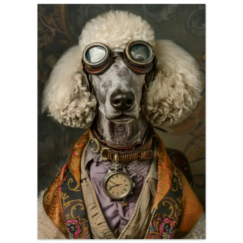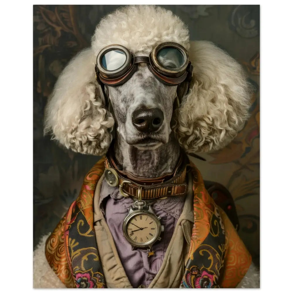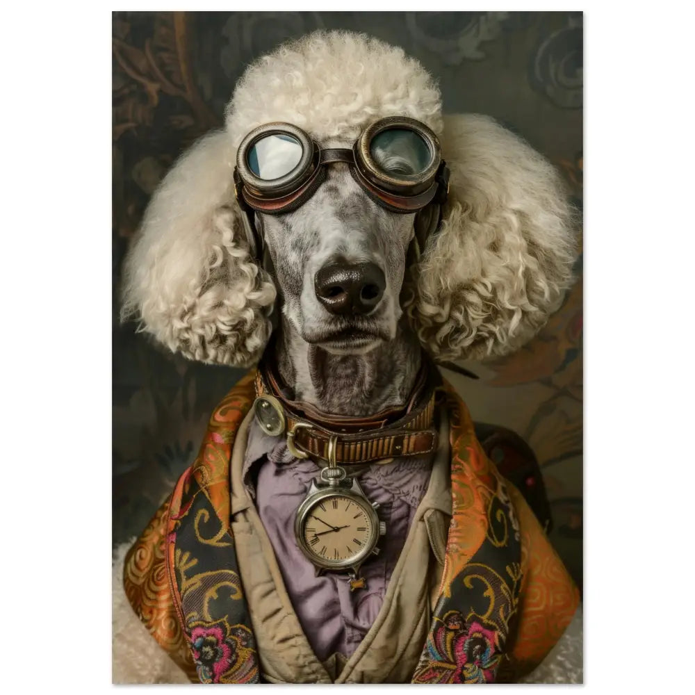 Deze afbeelding toont een hond, gekleed in een prachtige vintage steampunk outfit. Het draagt een extravagante, beige jas met ingewikkelde patronen en kleurrijke accenten. Om de nek hangt een antieke zilveren klok, die de aristocratische uitstraling versterkt. Het hoofd wordt gesierd door een paar grote, retro-futuristische brillen met bronzen metalen details, waardoor het eruitziet als een avontuurlijke tijdreiziger. De pootjes hebben elegante, grijze bontachtige manchetjes die het geheel afmaken. De achtergrond bestaat uit sierlijke patronen en een vleugje bloemen, wat de romantische sfeer van het schilderij benadrukt.