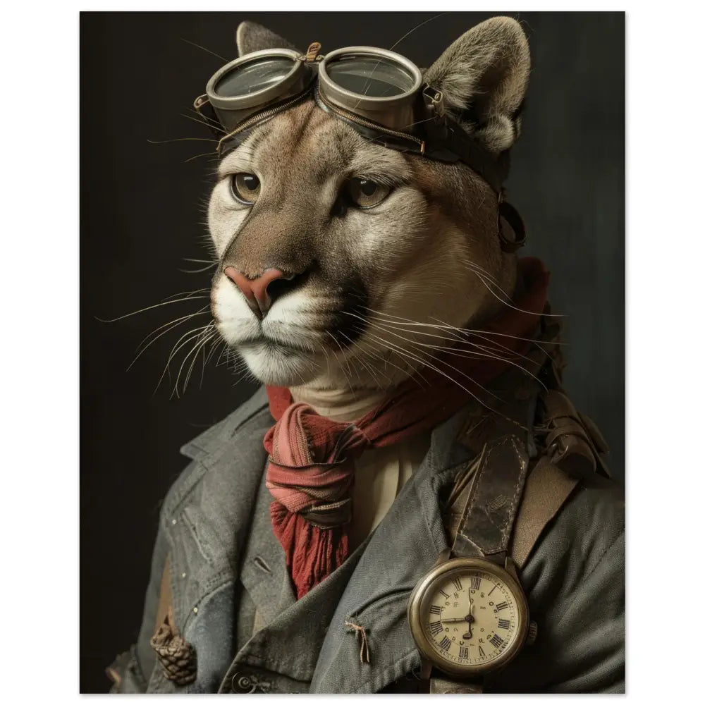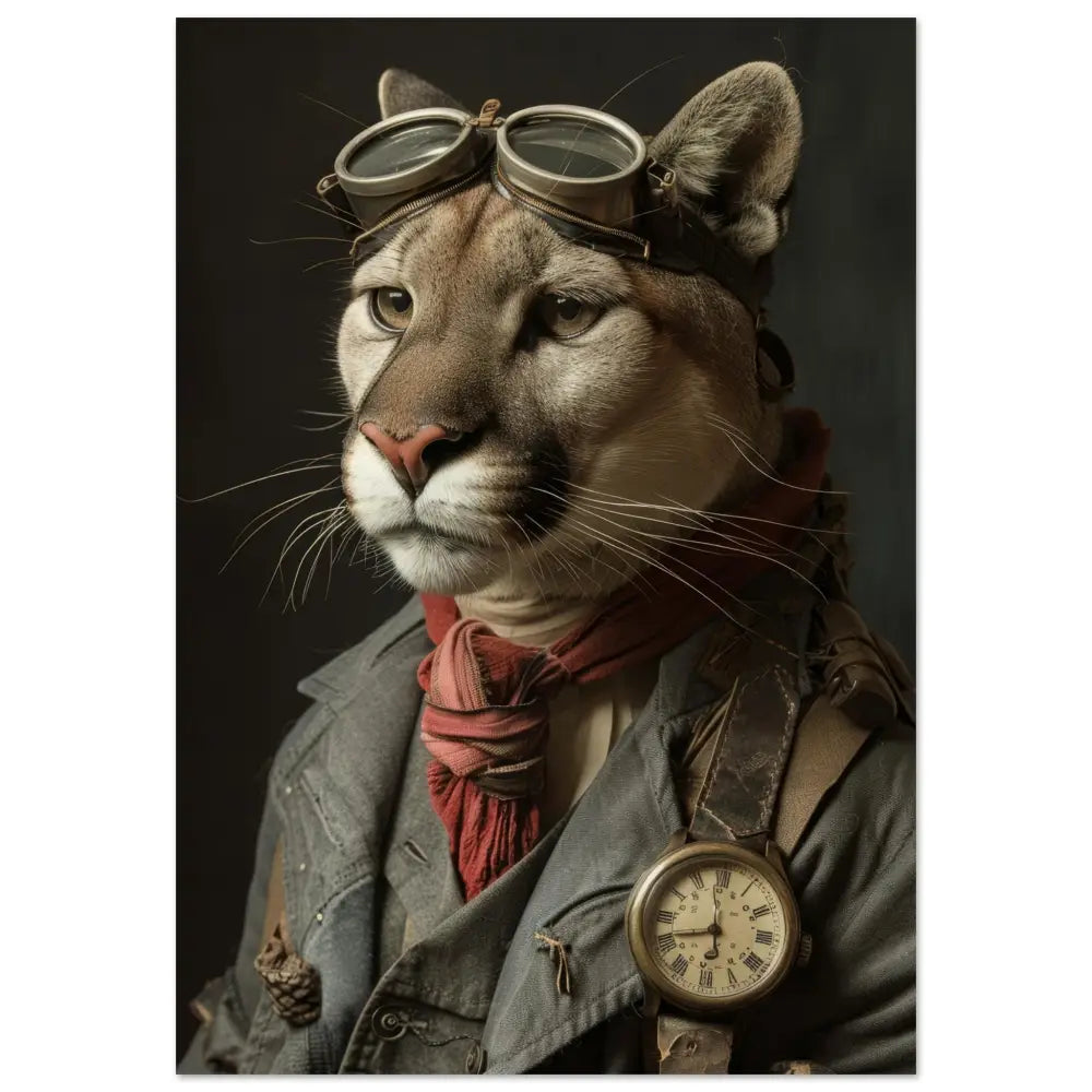 Deze afbeelding toont een dier, gekleed in een prachtige vintage steampunk outfit. Het draagt een elegante, grijze jas met subtiele stiksels en lederen accenten op de schouders. Om de nek hangt een antieke gouden klok, die schittert en een nobele uitstraling geeft. De kop wordt gesierd door een paar grote, retro-futuristische brillen met metalen details in een bronzen kleur, wat een avontuurlijke charme toevoegt. De pootjes en rug zijn versierd met ruige, leren accessoires die het geheel compleet maken. De donkere achtergrond benadrukt het sfeervolle en mysterieuze karakter van deze kunstige afbeelding.
