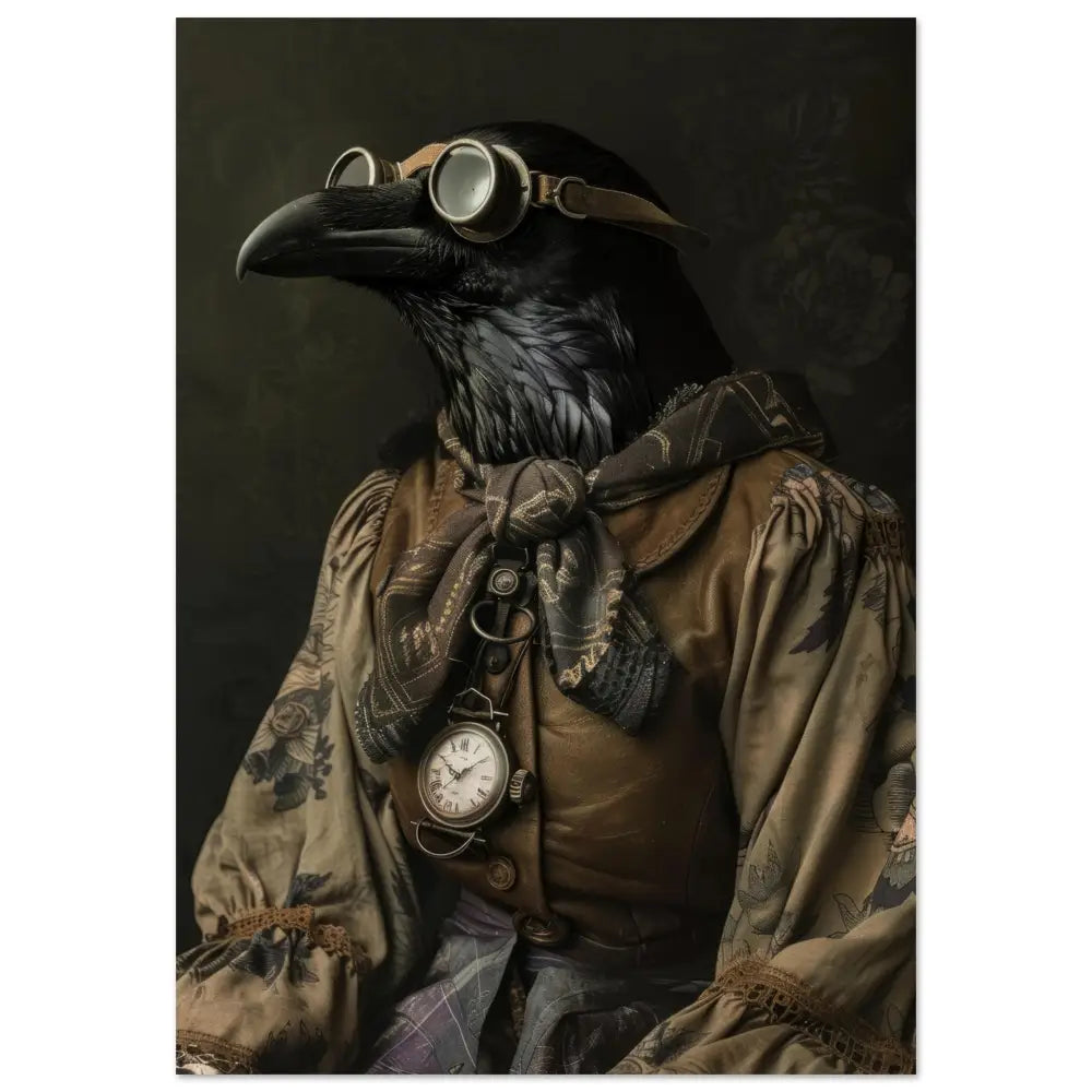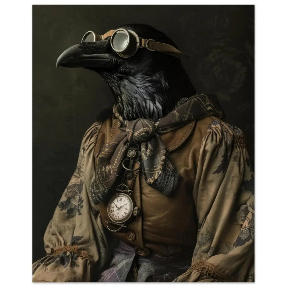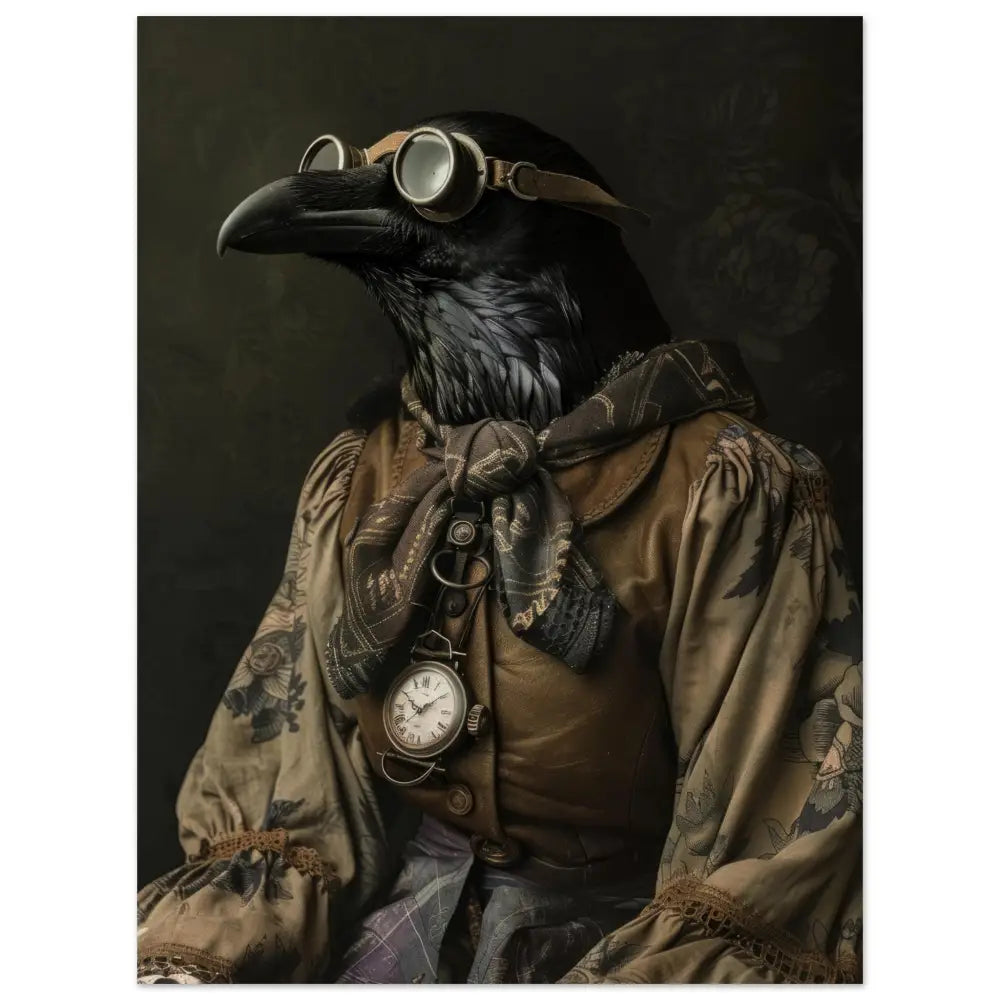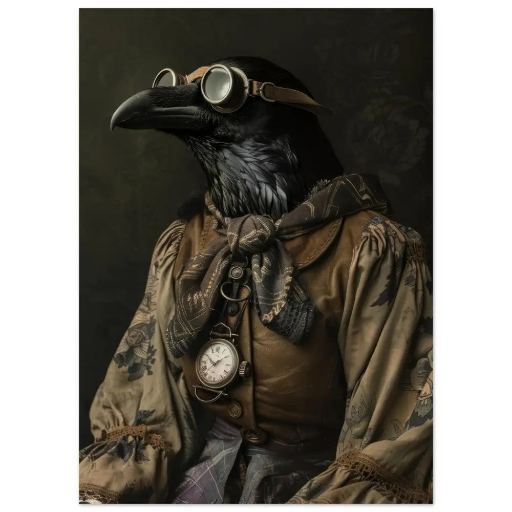 Deze afbeelding toont een dier, gekleed in een prachtige vintage steampunk outfit. Het draagt een elegante, bruine jas met ingewikkelde patronen en rijke, geborduurde accenten. Om de nek hangt een antieke bronzen klok, die subtiel glinstert tegen de donkere veren van het dier. Het hoofd wordt gesierd door een paar royale, retro-futuristische brillen met metalen details in koperkleur, benadrukkend het mysterie en de avontuurlijke geest. De vleugels zijn voorzien van grijze manchetjes met een vleugje kant, die het geheel verfijnd afmaken. De achtergrond is gedetailleerd met donkere, florale motieven voor een dramatisch effect.