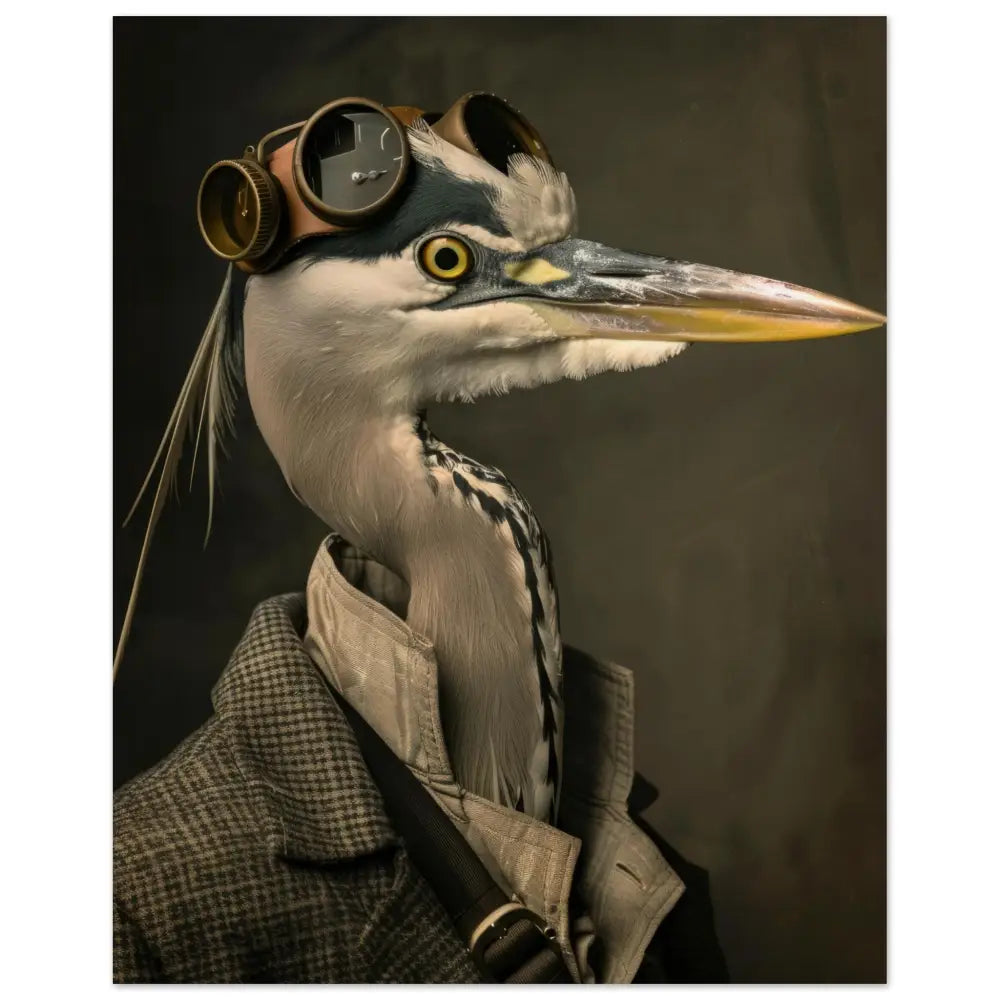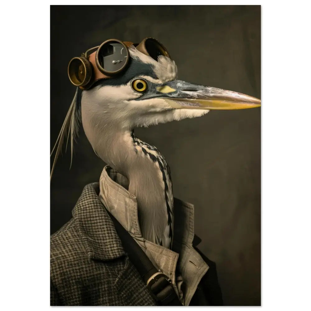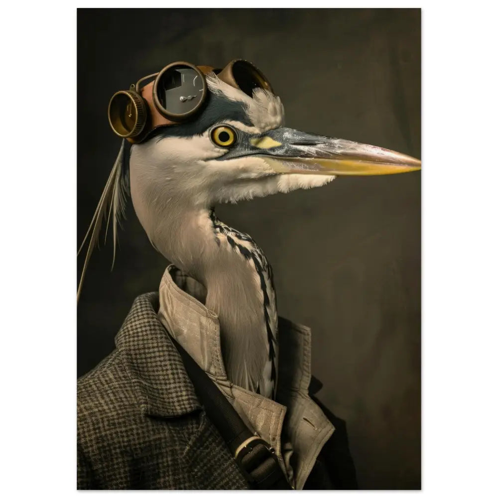 Deze afbeelding toont een dier, gekleed in een prachtige vintage steampunk outfit. Het draagt een elegante, beige jas met een fijn ruitpatroon en subtiele stiksels die de klassieke stijl benadrukken. Om de nek hangt een antieke, bronzen klok, een opvallend accessoire dat het historische gevoel benadrukt. De kop van de reiger wordt uitgerust met een paar indrukwekkende, koperkleurige brillen met schitterende metalen details, die de industriële kant van steampunk laten zien. Verder is de outfit afgewerkt met leren accenten en een stevige schouderriem, terwijl de achtergrond een donkere, mystieke sfeer uitstraalt, perfect passend bij het tijdloze steampunk thema.