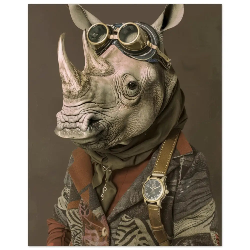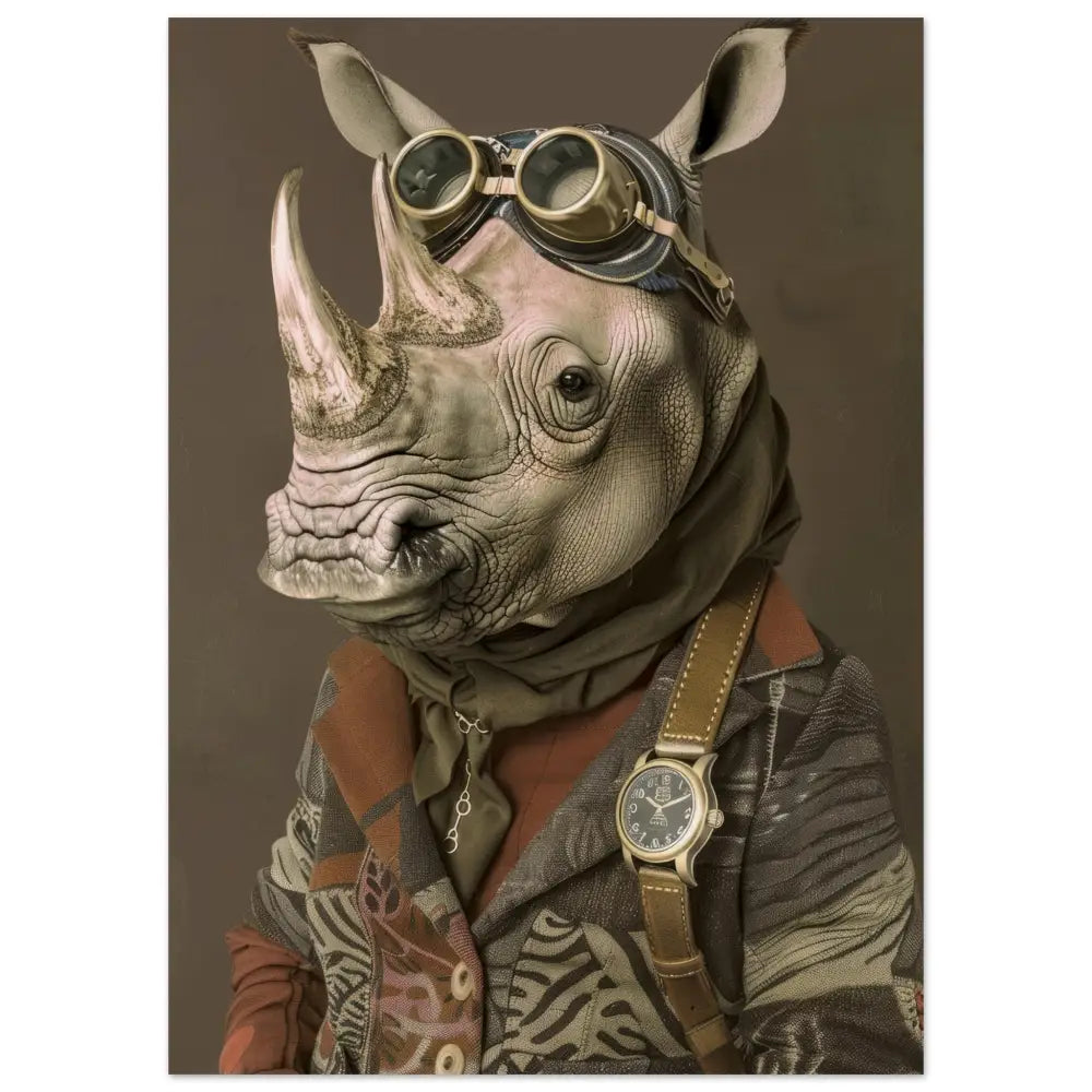 Deze afbeelding toont een dier, gekleed in een prachtige vintage steampunk outfit. Het draagt een opvallende jas met een mix van aardse tinten en abstracte patronen, die perfect de steampunk-stijl belichamen. Om de nek van het dier hangt een zware, bronzen antieke klok, die direct de aandacht trekt. Het hoofd van het dier is versierd met een robuuste bril met metalen details in goudkleur, en grote, ronde lenzen die een retro-futuristische uitstraling geven. De manchetjes van de jas zijn gedecoreerd met donkergroene bontachtige accenten, en leren riemen met contrasterende stiksels. De achtergrond is eenvoudig en houdt de focus op het gedetailleerde portret.