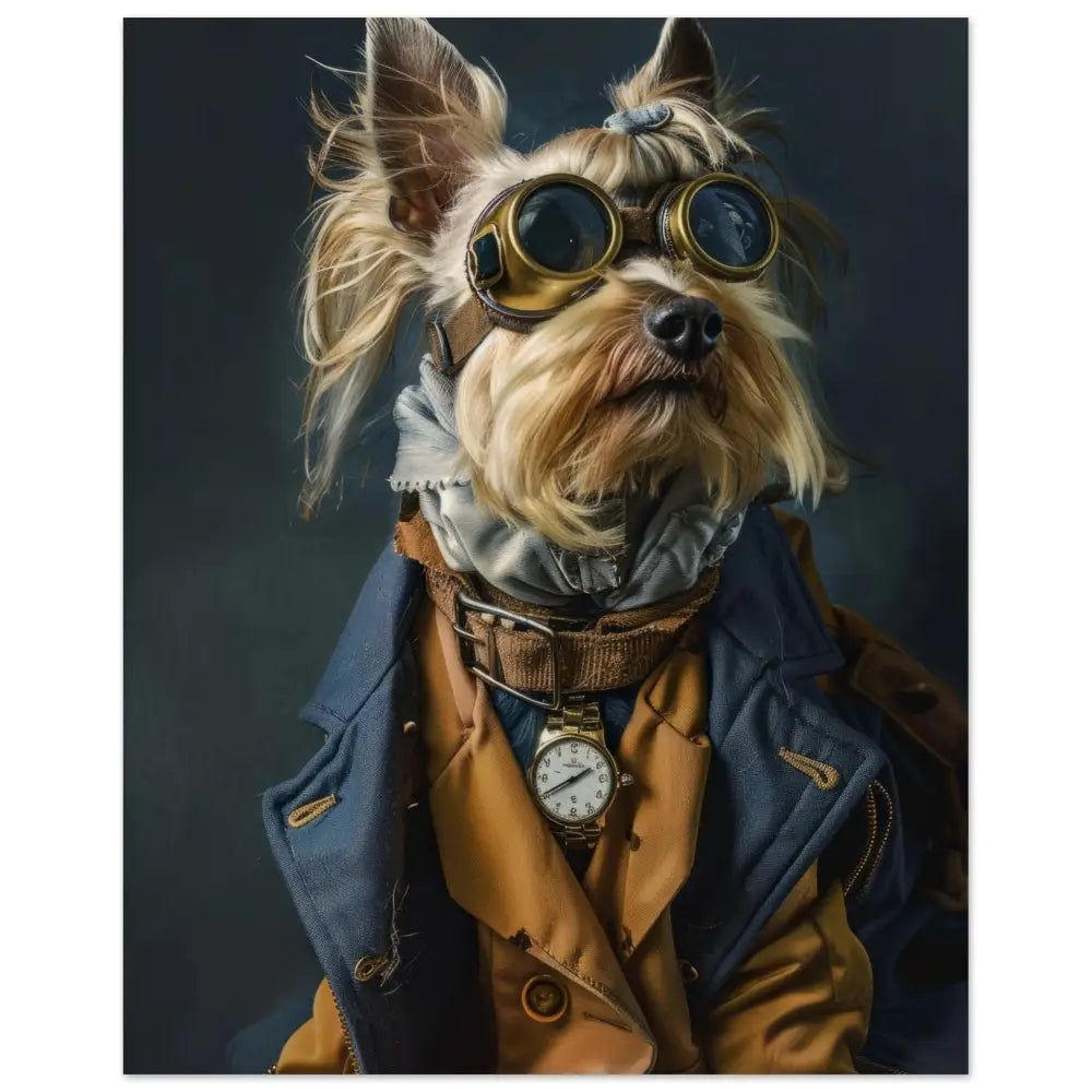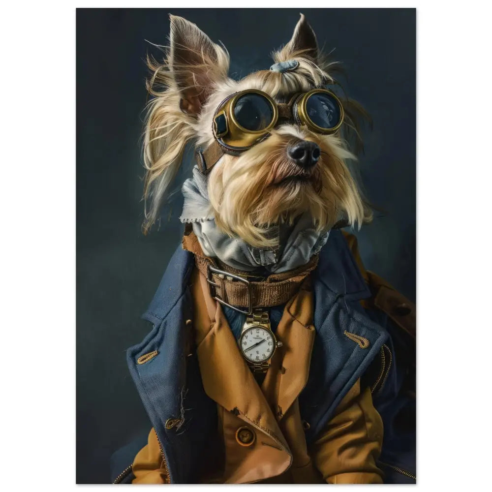 Deze afbeelding toont een dier, gekleed in een prachtige vintage steampunk outfit. Het draagt een elegante, diepblauwe jas met messingkleurige accenten en verfijnde stiksels. Om de nek hangt een antieke gouden klok, die de stijlvolle look perfect aanvult. De kop wordt gesierd door een paar indrukwekkende, retro-futuristische brillen met metalen details in brons, wat een avontuurlijke, ouderwetse charme toevoegt. De kleine pootjes zijn voorzien van rustieke leren accenten en contrasterende stiksels die het geheel nog completer maken. De achtergrond van de afbeelding is een donkere, mysterieuze kleur die de focus op het dier houdt.