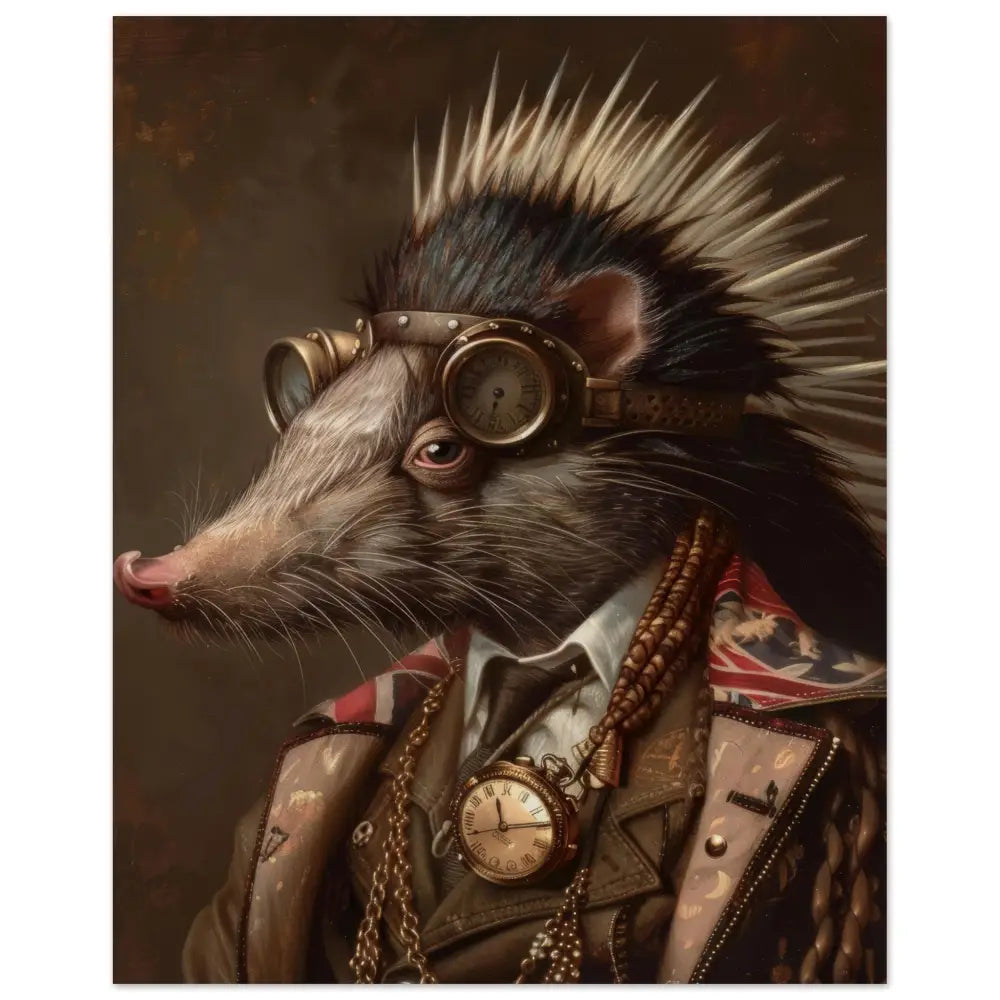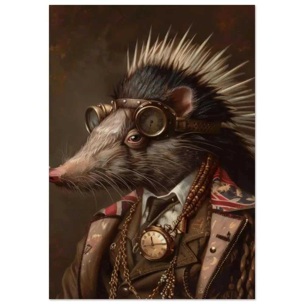 Deze afbeelding toont een dier, gekleed in een prachtige vintage steampunk outfit. Het draagt een stijlvolle, olijfgroene jas met subtiele gouden patronen en leren schouderstukken. Om de nek hangt een antieke bronzen klok, die een sfeer van tijdloosheid toevoegt. De kop is voorzien van een groot, verfijnd veiligheidsbril met koperen details, waardoor het een authentieke steampunk-look krijgt. De poten zijn gedecoreerd met stevige, zwarte leren manchetten met zilveren stiksels, die het geheel een robuust uiterlijk geven. De achtergrond is rustiek met een donkere, aardse tint, die de tijdloze elegantie van de steampunk-thema benadrukt.