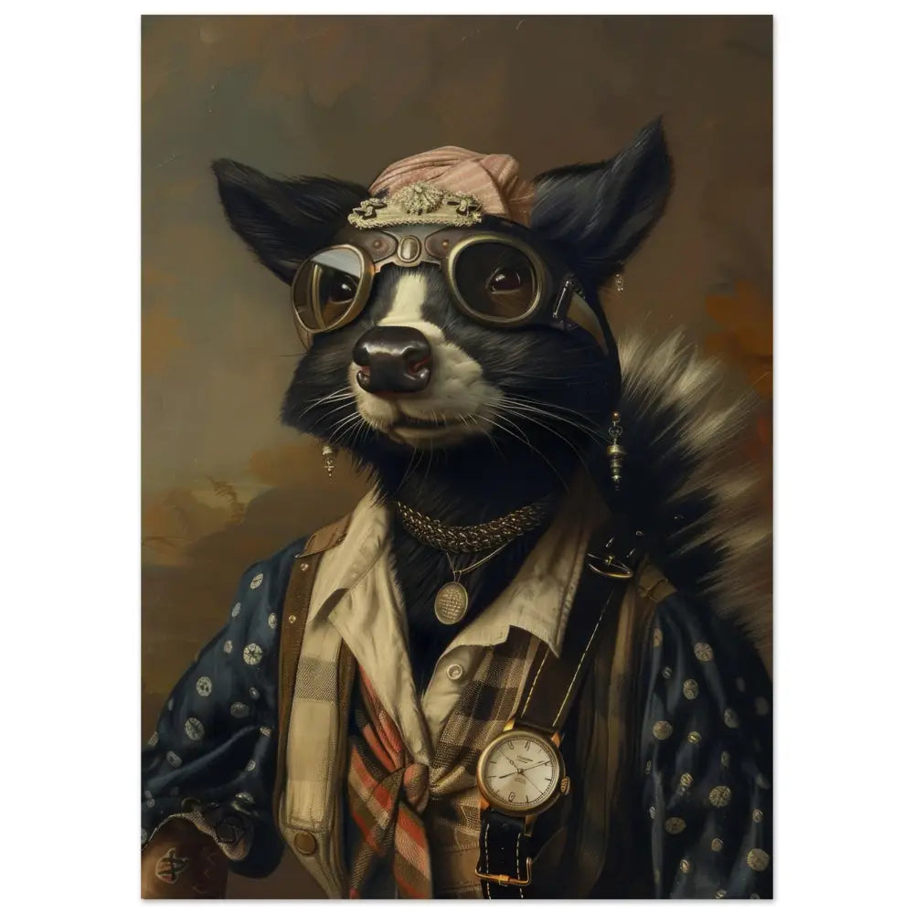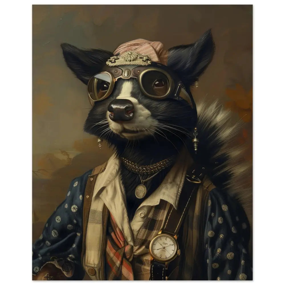 Deze afbeelding toont een dier, gekleed in een prachtige vintage steampunk outfit. Het draagt een elegante, donkerblauwe jas met fijne witte stippen en luxe leren accenten. Om de nek hangt een antieke bronzen klok, wat bijdraagt aan de verfijnde uitstraling. De kop is versierd met een stoere, retro-futuristische brillen met metalen details in kopertint, wat het een avontuurlijke uitstraling geeft. De pootjes zijn gesierd met verfijnde, crèmekleurige bontachtige manchetjes en contrasterende stiksels. De achtergrond van deze afbeelding toont een zachte, vervaagde landschapsachtergrond, die een vleugje mysterie en charme toevoegt.
