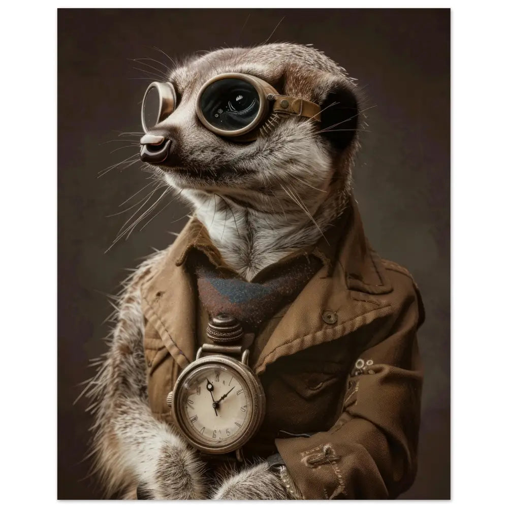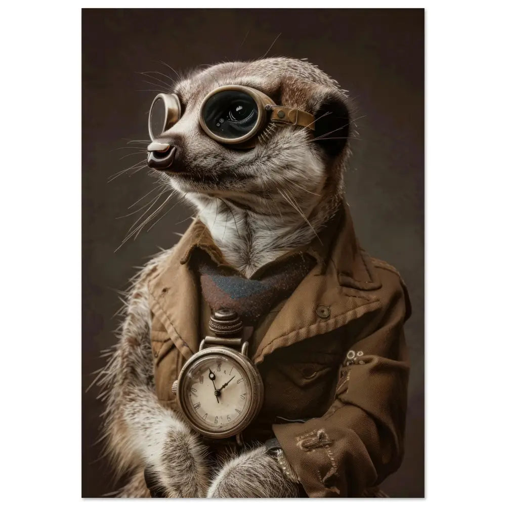 Deze afbeelding toont een dier, gekleed in een prachtige vintage steampunk outfit. Het draagt een elegante bruine jas met subtiele stiksels en knopen die een gedetailleerde, ambachtelijke uitstraling geven. Om de nek van het dier hangt een antieke, bronzen klok, die een gevoel van tijdloosheid en avontuur uitstraalt. De kop is versierd met een paar robuuste, retro-futuristische brillen, afgewerkt met gouden metalen details, wat een gedurfde en nieuwsgierige look geeft. Leren accenten en delicate contrasterende stiksels verfraaien zijn voorpoten, terwijl de achtergrond bestaat uit een donkere, rokerige sfeer die perfect aansluit bij de steampunk esthetiek.
