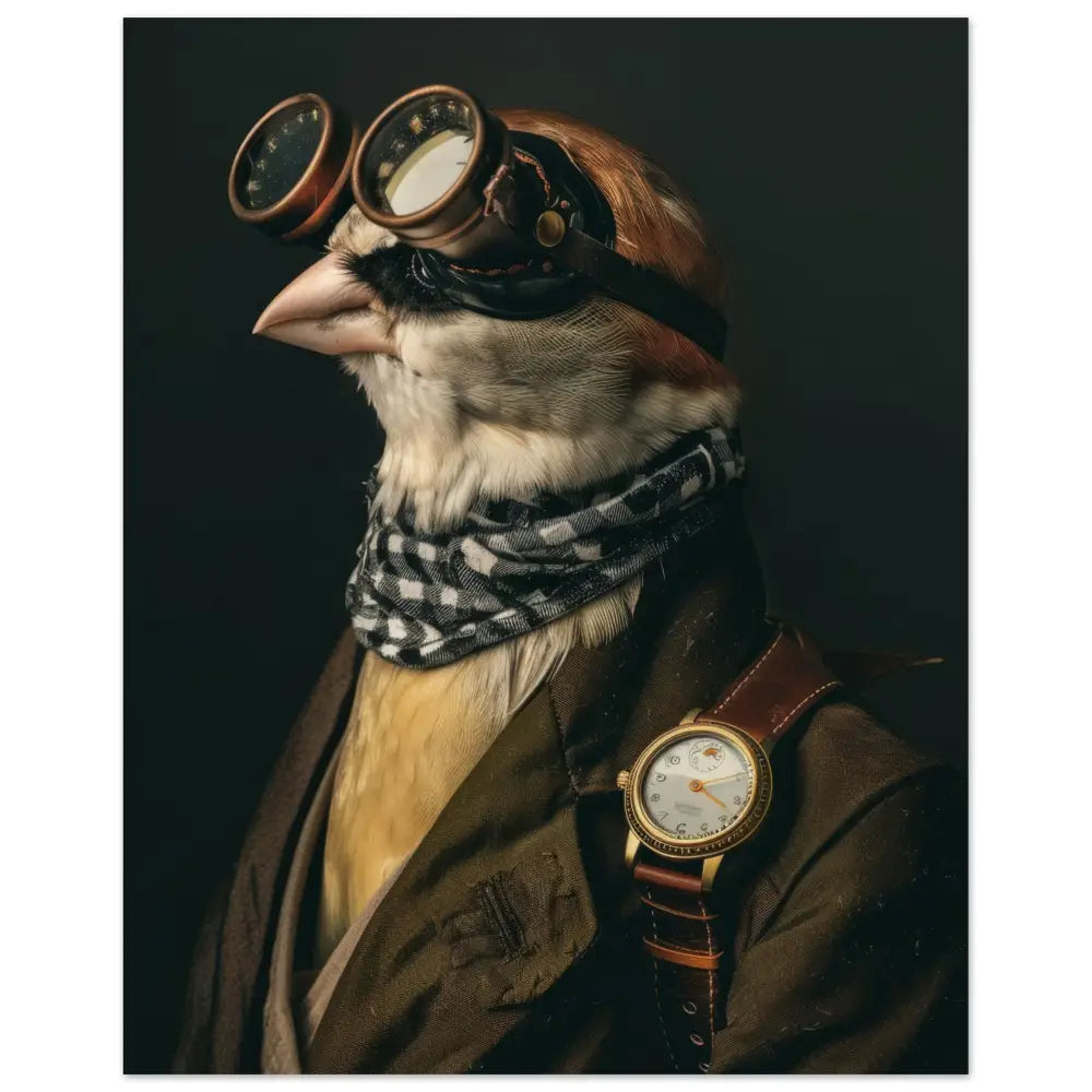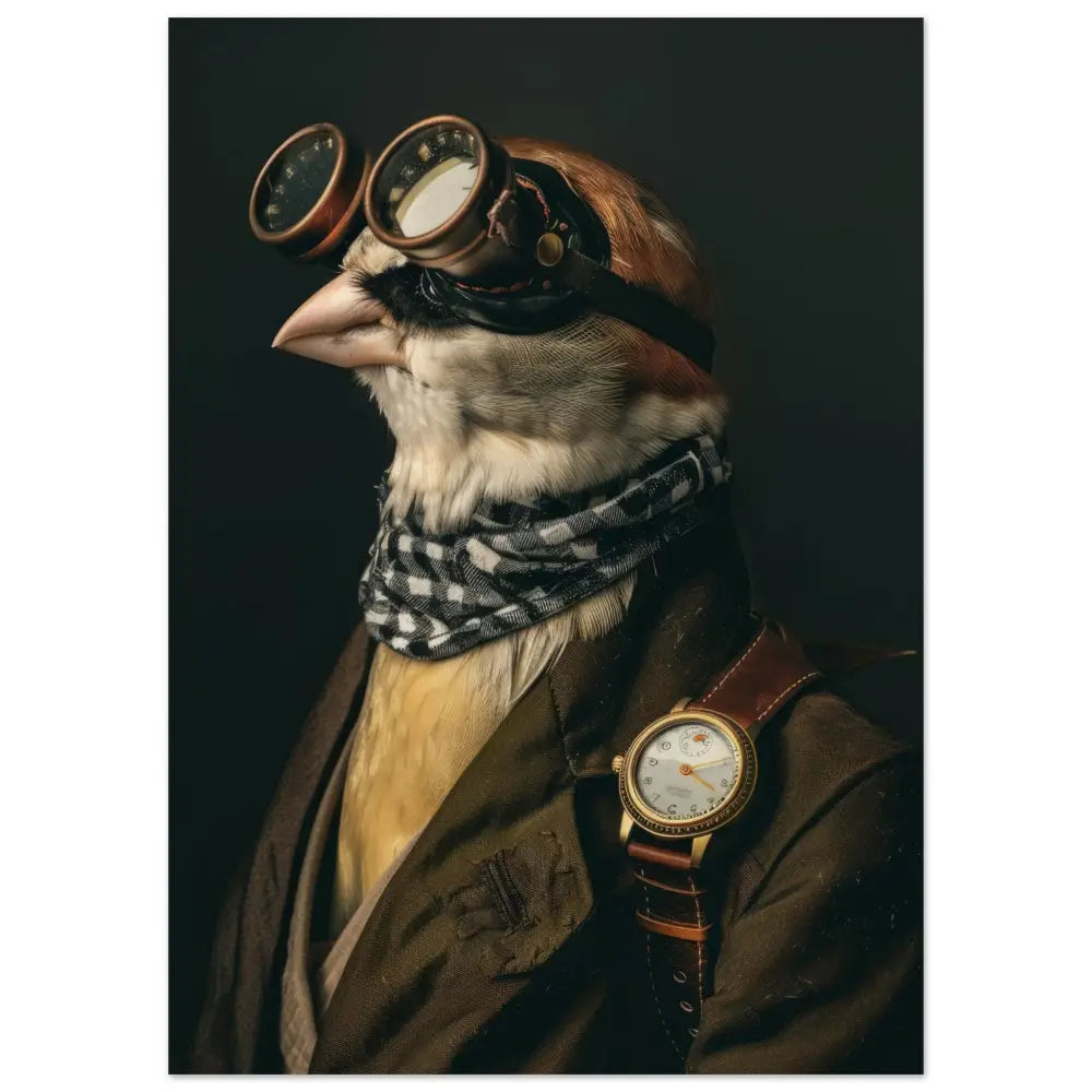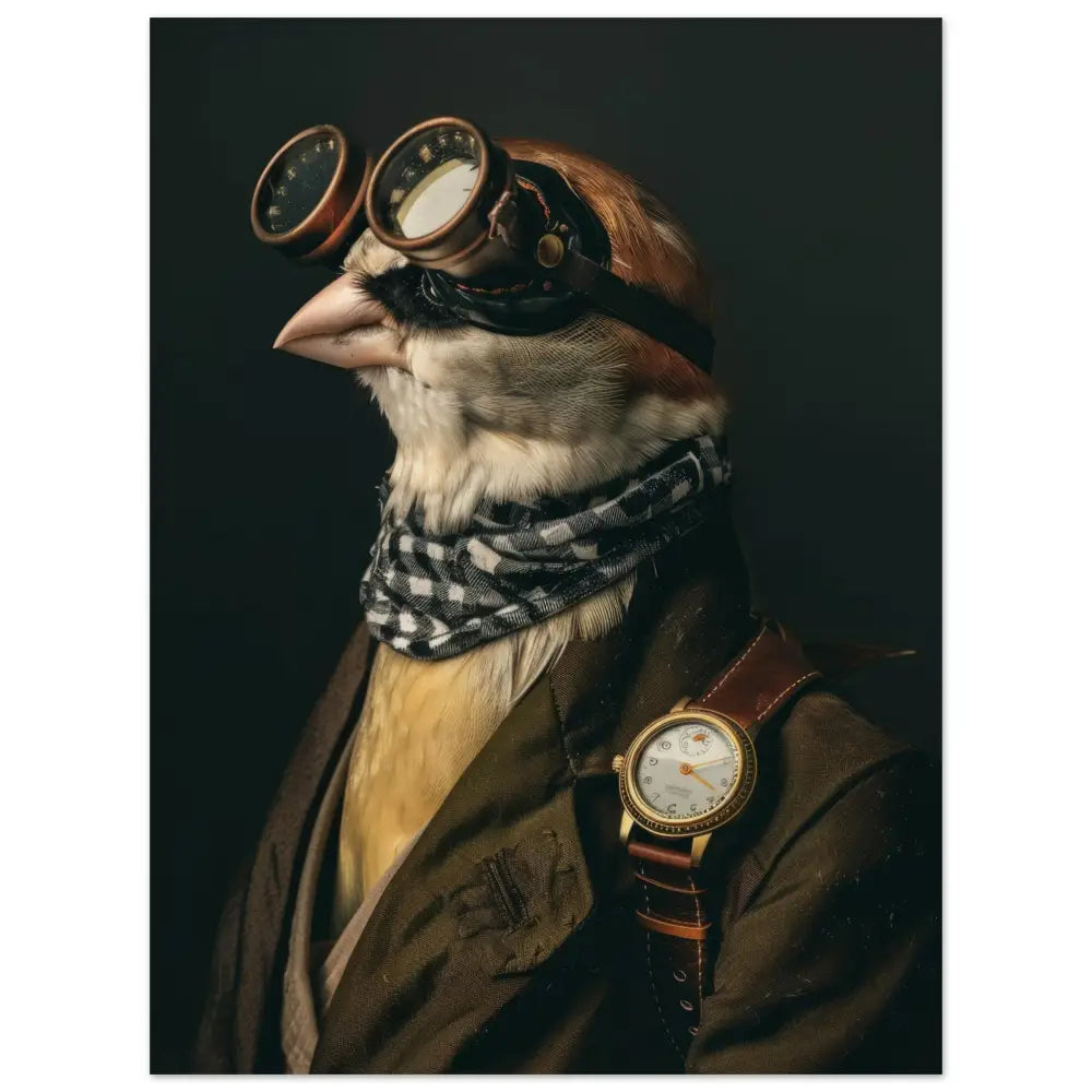 Deze afbeelding toont een vogel, gekleed in een prachtige steampunk outfit. Het draagt een elegante, donkere jas met subtiele geweven patronen en leren accenten. Om de nek hangt een antieke gouden klok, zorgvuldig bevestigd met een leren riem, die de tijdloze charme van het ensemble benadrukt. Op het hoofd van de vogel prijkt een paar grote, bronzen retro-futuristische brillen met verfijnde metalen details, die het geheel voorzien van een avontuurlijke flair. Extra elementen zoals robuuste manchetjes en contrasterende stiksels geven de outfit extra diepgang. De achtergrond is donker en minimalistisch, waardoor de aandacht volledig naar de vogel en zijn gedetailleerde outfit gaat.