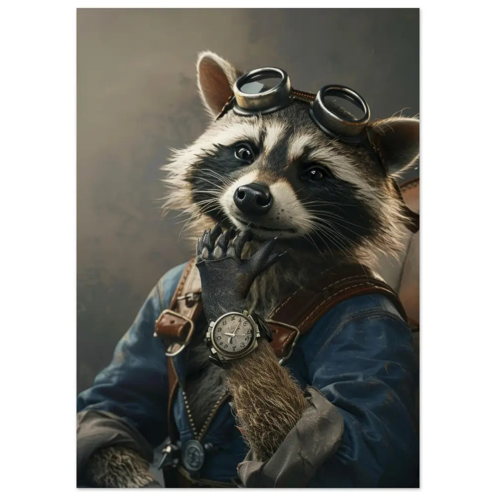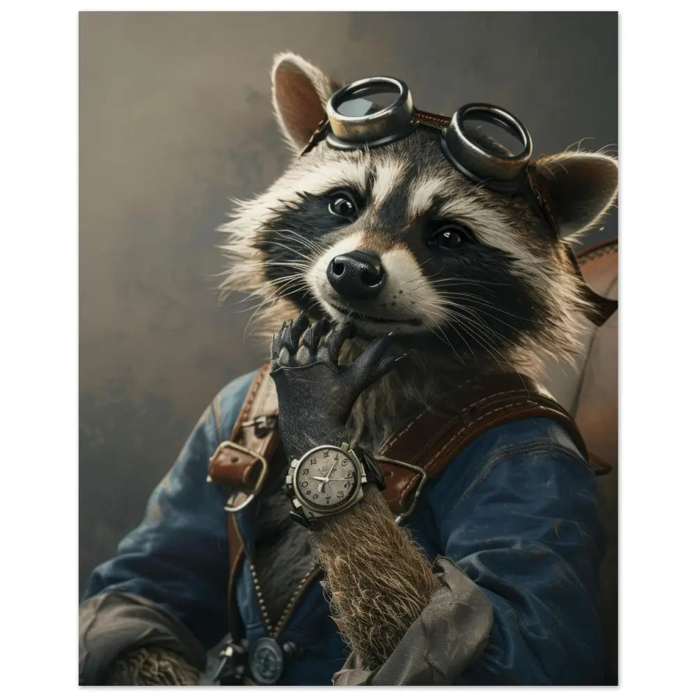 Deze afbeelding toont een dier, gekleed in een prachtige vintage steampunk outfit. Het draagt een elegante, blauwe jas met subtiele koperkleurige accenten en leren riemen. Om de pols hangt een antieke zilveren klok, die de polsspel verder benadrukt. De kop wordt gesierd door een stoere, retro-futuristische bril met metalen details in een verweerde bronzen tint, die doet denken aan een ontdekkingsreiziger uit een andere tijd. De pootjes zijn versierd met grijze bontachtige manchetjes die een vleugje luxe toevoegen. De achtergrond is sfeervol en mysterieus, met een wazig, gedetailleerd patroon dat het steampunk-thema versterkt.