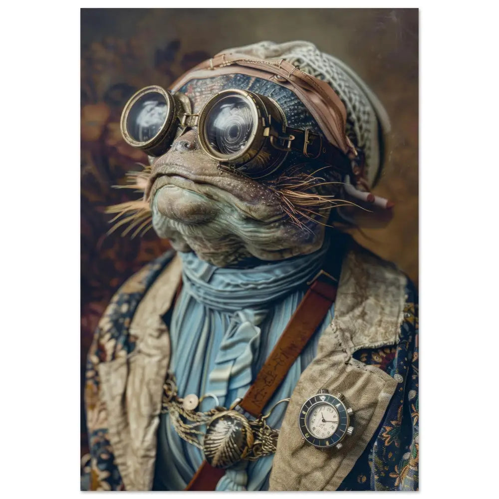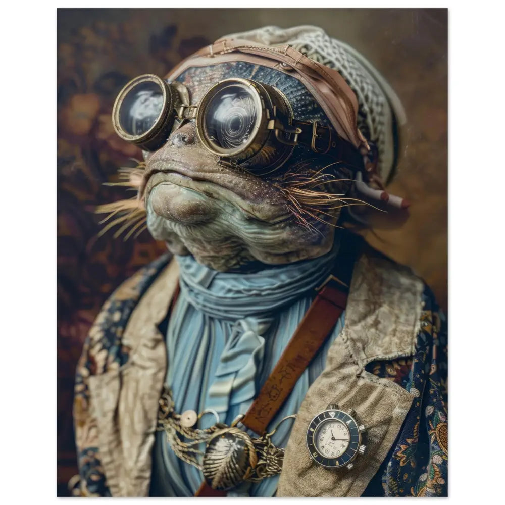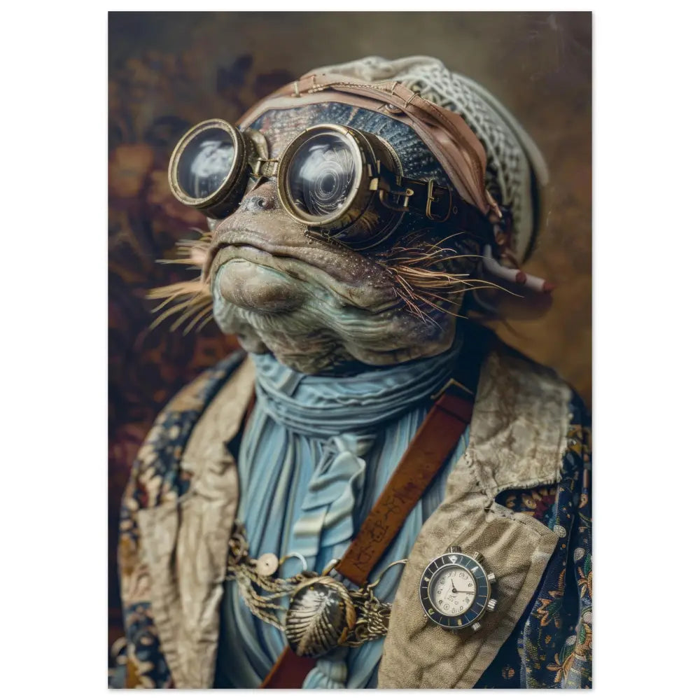 Deze afbeelding toont een dier, gekleed in een prachtige steampunk outfit. Het draagt een verfijnde, blauw-gestreepte jas met complexe patronen en een vintage look. Om de nek hangt een antieke zilveren klok, die de nostalgische sfeer versterkt. De kop wordt gesierd door een paar grote, retro-futuristische brillen met metalen details in bronskleur, wat hint naar een verleden vol avontuur. De borst is voorzien van elegante, beige bontachtige manchetjes die een vleugje elegantie toevoegen. De achtergrond is rijkelijk gedecoreerd met bloemmotieven, die het geheel een schilderachtige en romantische sfeer geven.