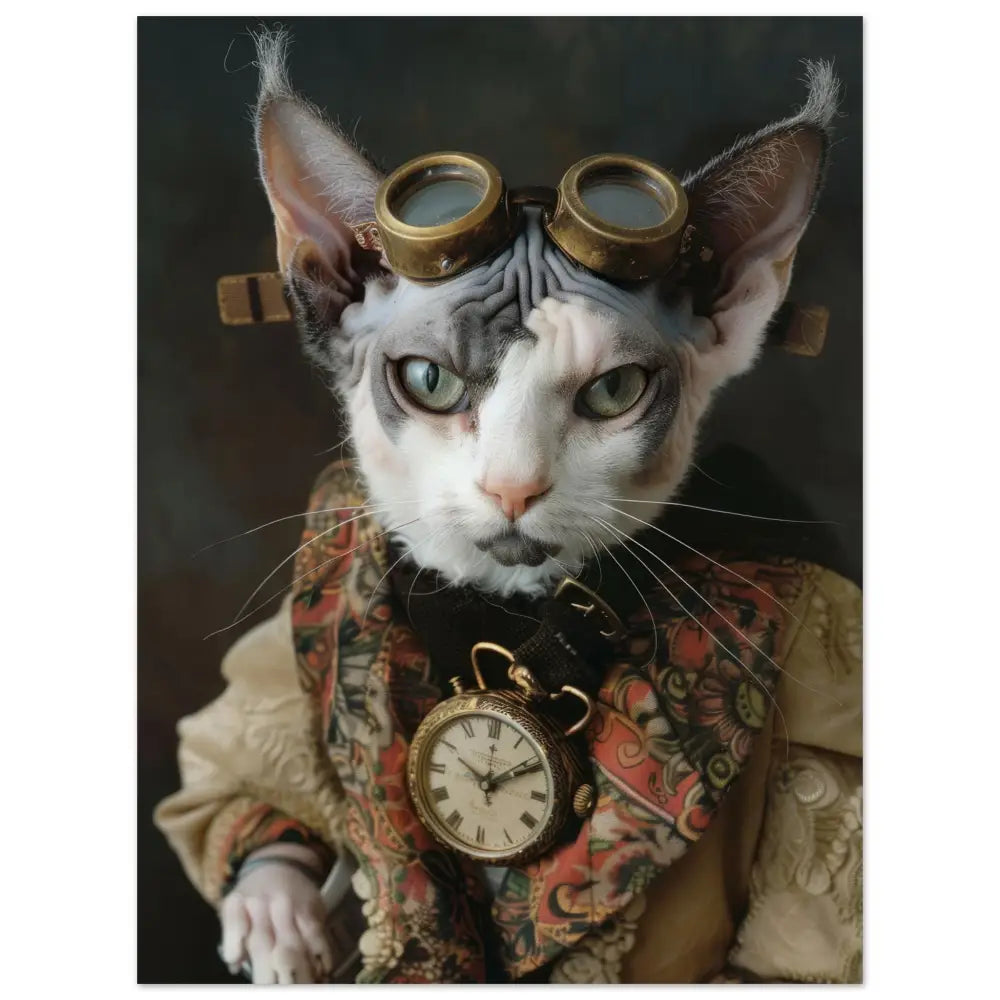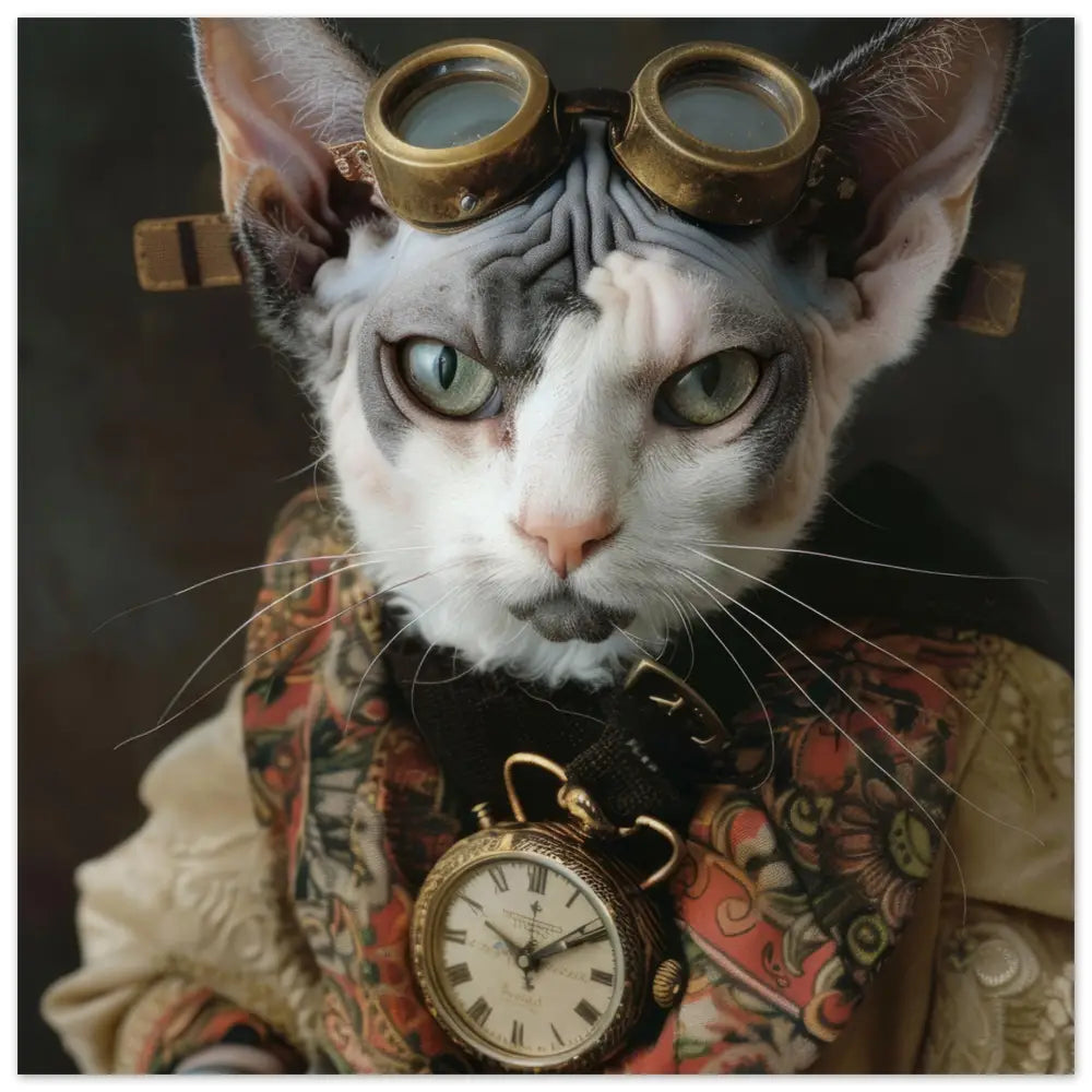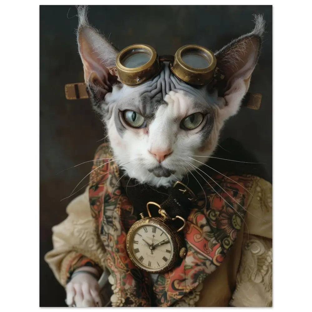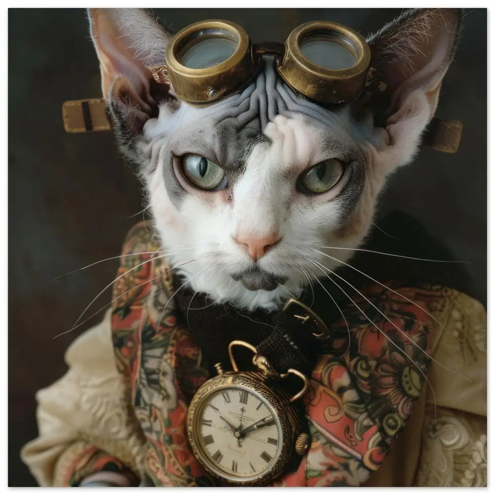 Dit schilderij toont een kat, gekleed in een prachtige vintage steampunk outfit. Hij draagt een sierlijke, crèmekleurige jas met ingewikkelde patronen en fluwelen accenten. Om zijn nek hangt een antieke, gouden klok, die zijn aristocratische uitstraling versterkt. Zijn kop wordt gesierd door een paar grote, retro-futuristische brillen met metalen details in bronskleur, waardoor hij eruitziet als een avontuurlijke tijdreiziger. Zijn pootjes zijn voorzien van elegante, zwarte bontachtige manchetjes die het geheel afmaken. De achtergrond van de afbeelding is donker en mysterieus, wat de magische sfeer van het steampunk-thema benadrukt.
