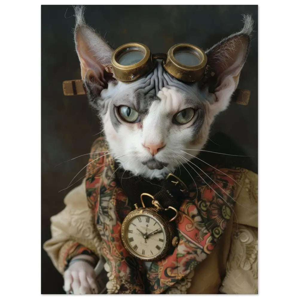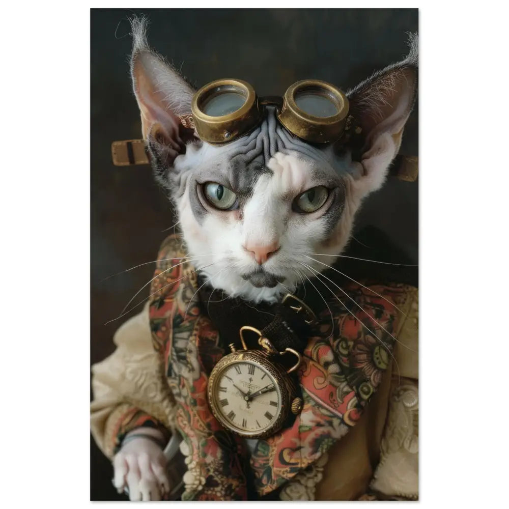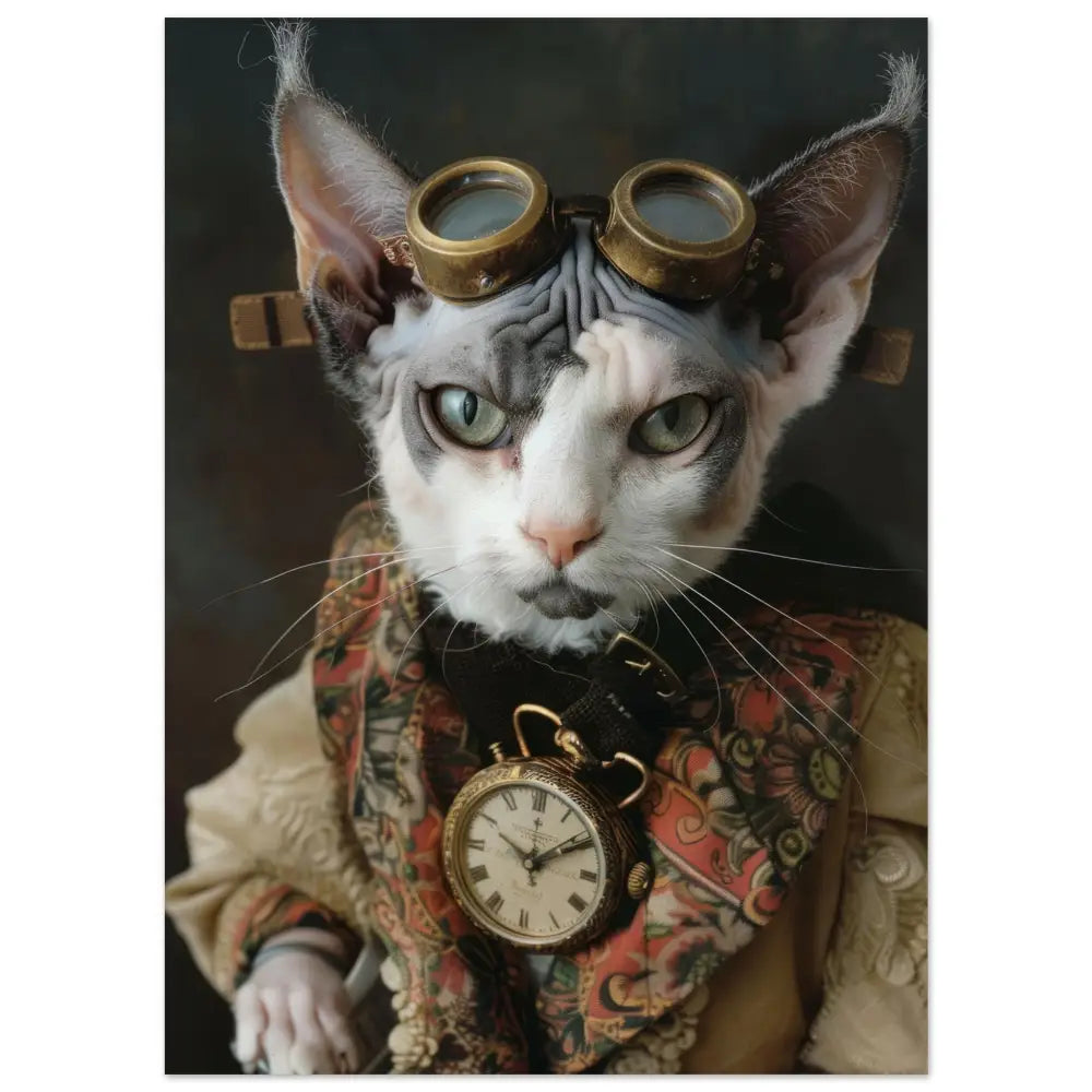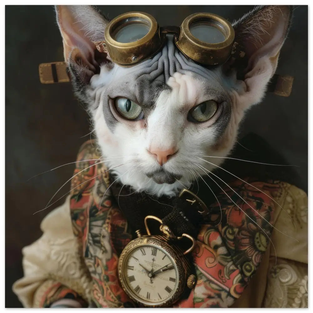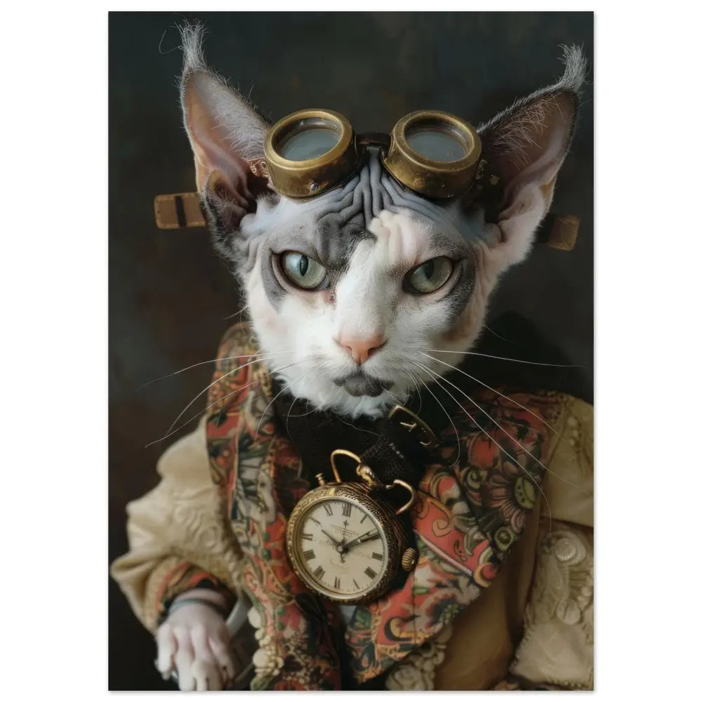 Dit schilderij toont een kat, gekleed in een prachtige vintage steampunk outfit. Hij draagt een sierlijke, crèmekleurige jas met ingewikkelde patronen en fluwelen accenten. Om zijn nek hangt een antieke, gouden klok, die zijn aristocratische uitstraling versterkt. Zijn kop wordt gesierd door een paar grote, retro-futuristische brillen met metalen details in bronskleur, waardoor hij eruitziet als een avontuurlijke tijdreiziger. Zijn pootjes zijn voorzien van elegante, zwarte bontachtige manchetjes die het geheel afmaken. De achtergrond van de afbeelding is donker en mysterieus, wat de magische sfeer van het steampunk-thema benadrukt.
