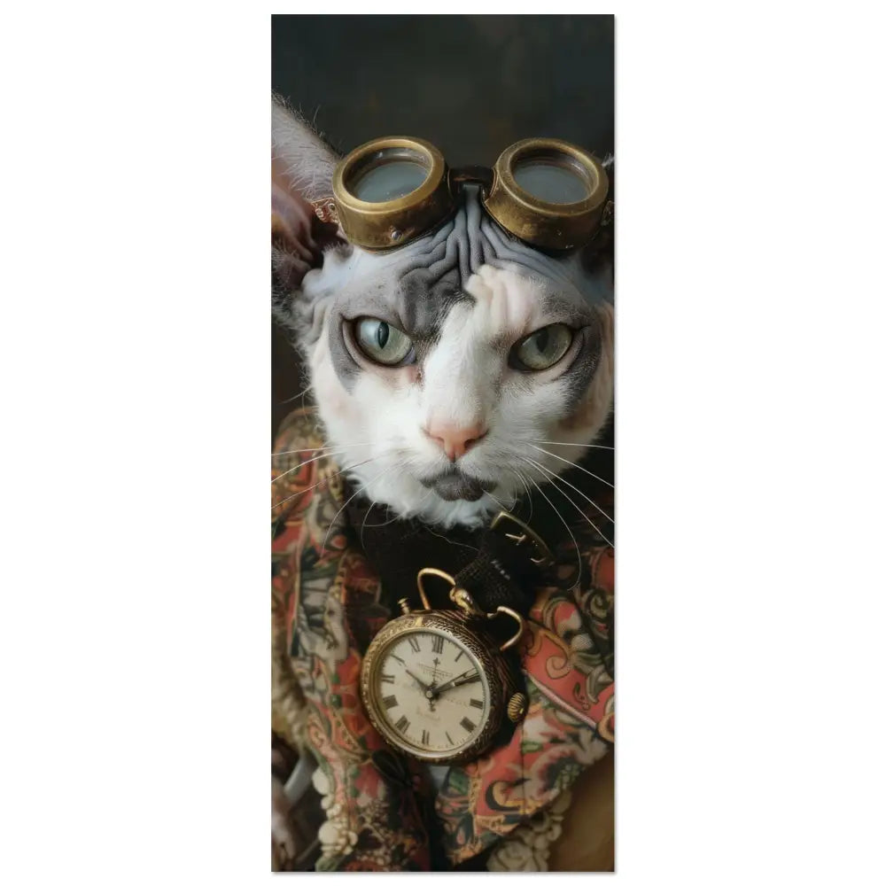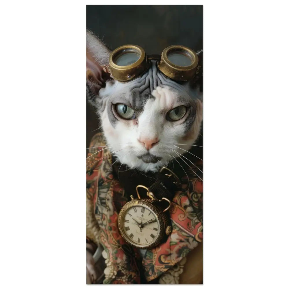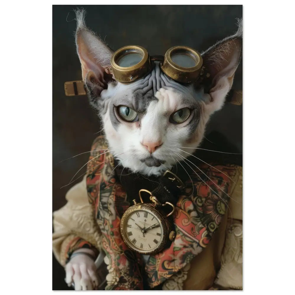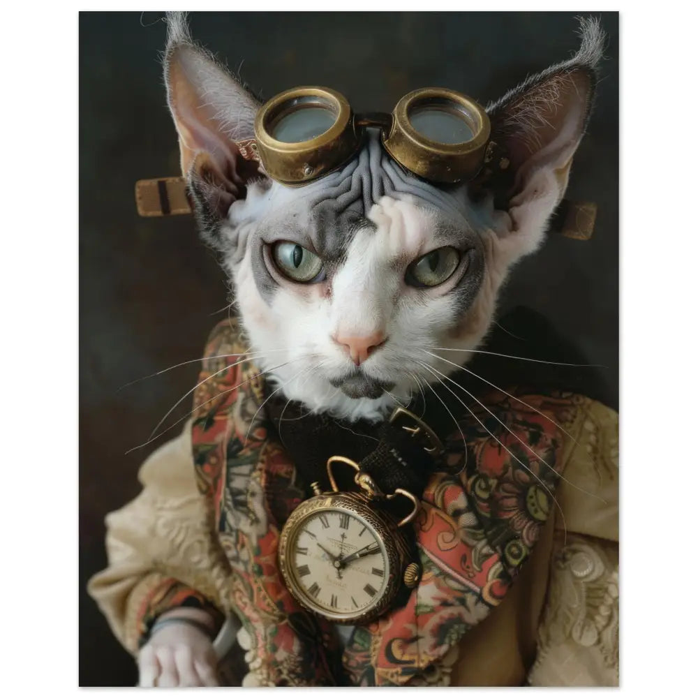 Dit schilderij toont een kat, gekleed in een prachtige vintage steampunk outfit. Hij draagt een sierlijke, crèmekleurige jas met ingewikkelde patronen en fluwelen accenten. Om zijn nek hangt een antieke, gouden klok, die zijn aristocratische uitstraling versterkt. Zijn kop wordt gesierd door een paar grote, retro-futuristische brillen met metalen details in bronskleur, waardoor hij eruitziet als een avontuurlijke tijdreiziger. Zijn pootjes zijn voorzien van elegante, zwarte bontachtige manchetjes die het geheel afmaken. De achtergrond van de afbeelding is donker en mysterieus, wat de magische sfeer van het steampunk-thema benadrukt.